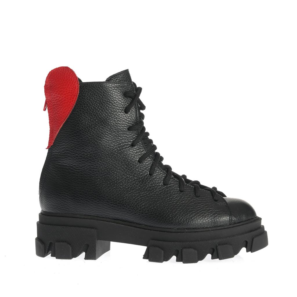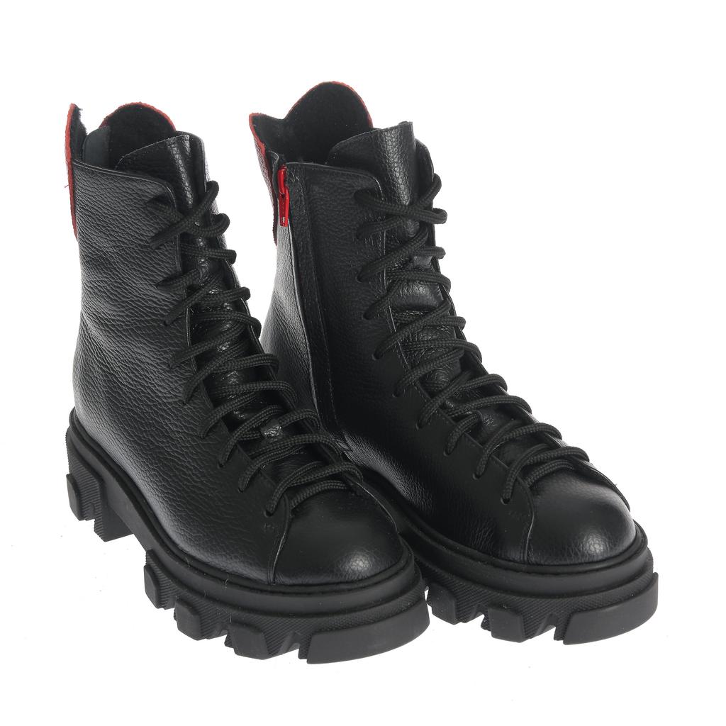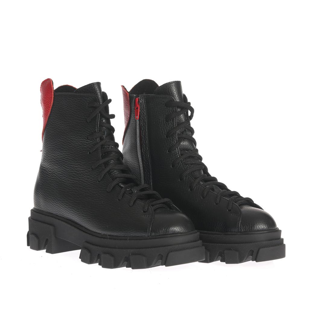 Bocancii Diana combină o construcție robustă cu un design modern, fiind fabricați din piele rezistentă neagră, cu accente elegante de piele roșie pe călcâi și fermoar. Talpa lugged de cauciuc asigură tracțiune superioară și stabilitate pe diverse suprafețe, făcându-i potriviți pentru uz casual sau pentru ocazii când doriți un plus de stil și funcționalitate. Încălțămintea se fixează atât cu șireturi, cât și cu un fermoar lateral pentru o utilizare comodă. Forma rotundă a vârfului și talpa plată contribuie la confortul purtării zilnice. Acești bocanci sunt alegerea ideală pentru un look fashion și practic în același timp.