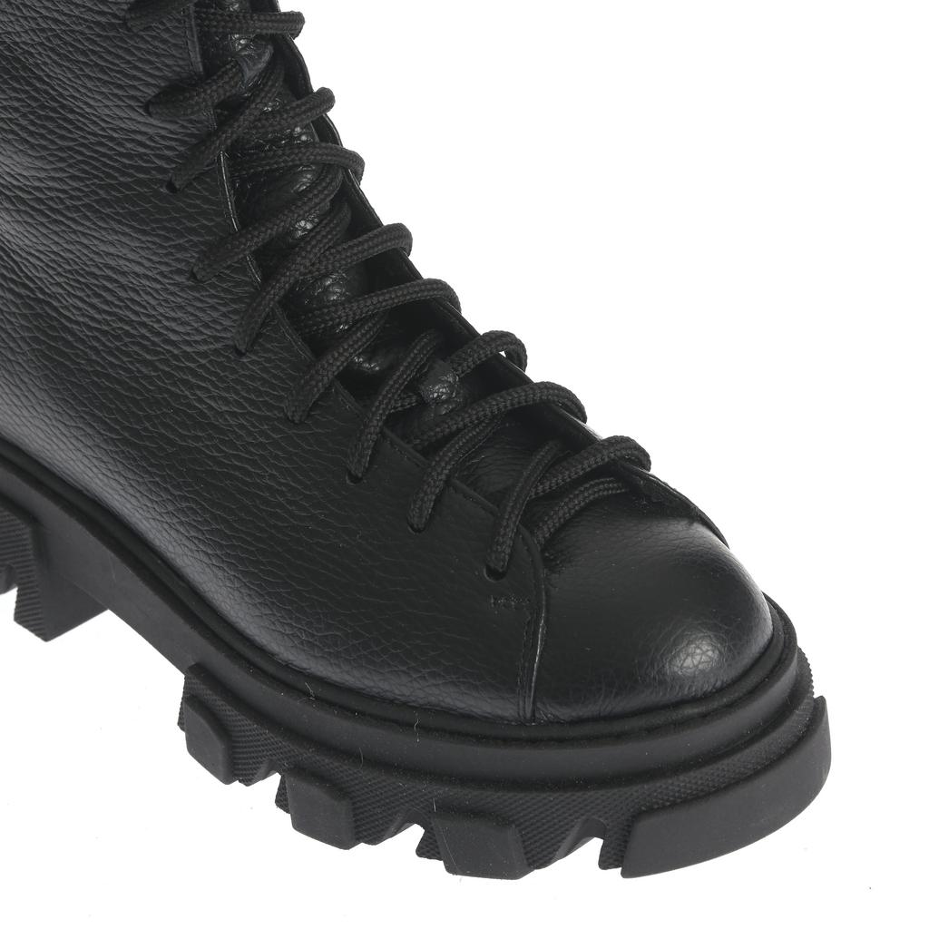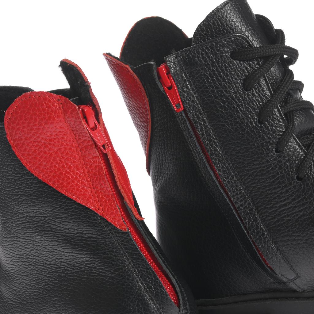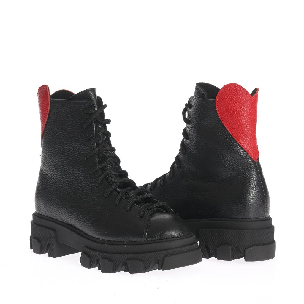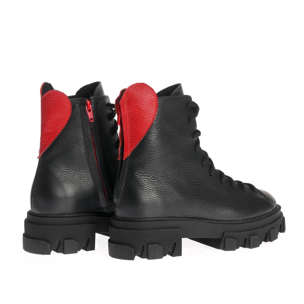 Bocancii Diana combină o construcție robustă cu un design modern, fiind fabricați din piele rezistentă neagră, cu accente elegante de piele roșie pe călcâi și fermoar. Talpa lugged de cauciuc asigură tracțiune superioară și stabilitate pe diverse suprafețe, făcându-i potriviți pentru uz casual sau pentru ocazii când doriți un plus de stil și funcționalitate. Încălțămintea se fixează atât cu șireturi, cât și cu un fermoar lateral pentru o utilizare comodă. Forma rotundă a vârfului și talpa plată contribuie la confortul purtării zilnice. Acești bocanci sunt alegerea ideală pentru un look fashion și practic în același timp.