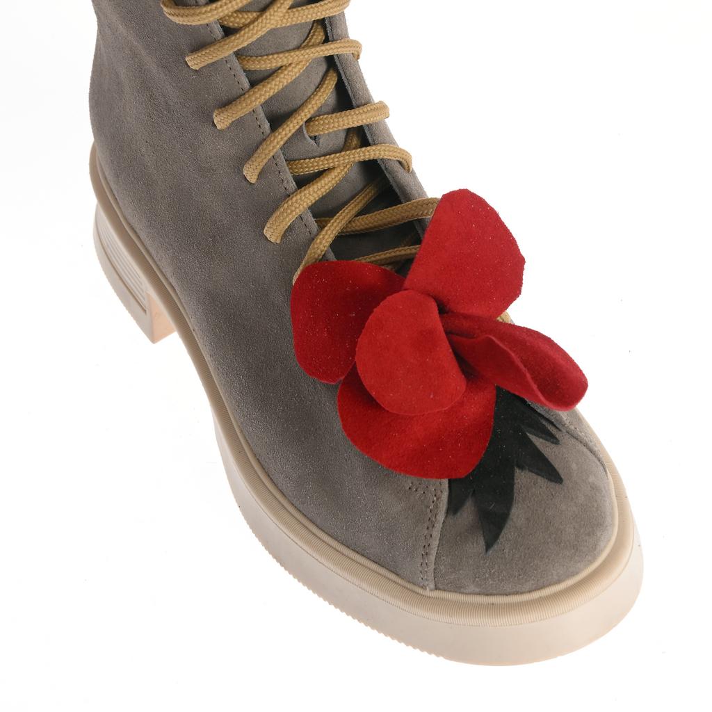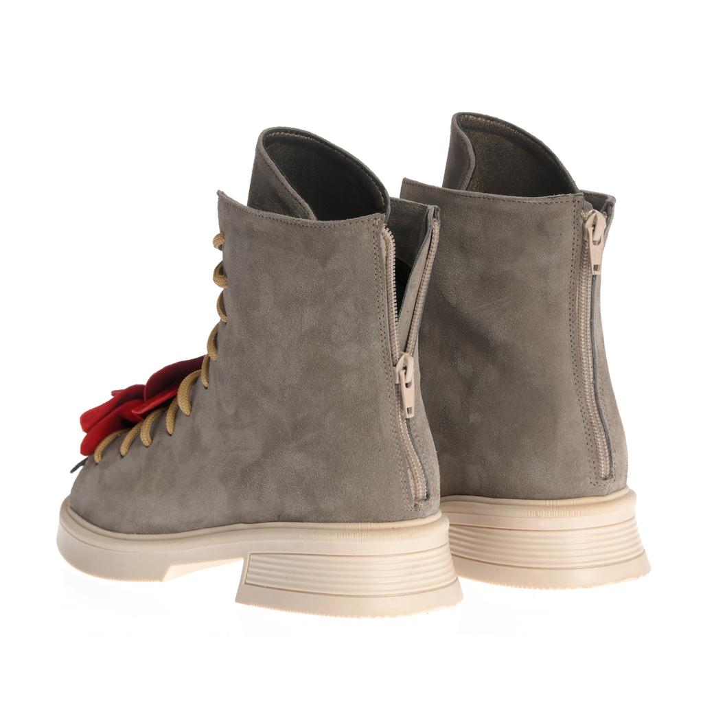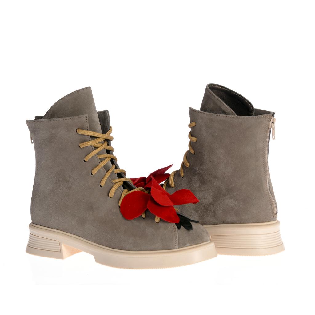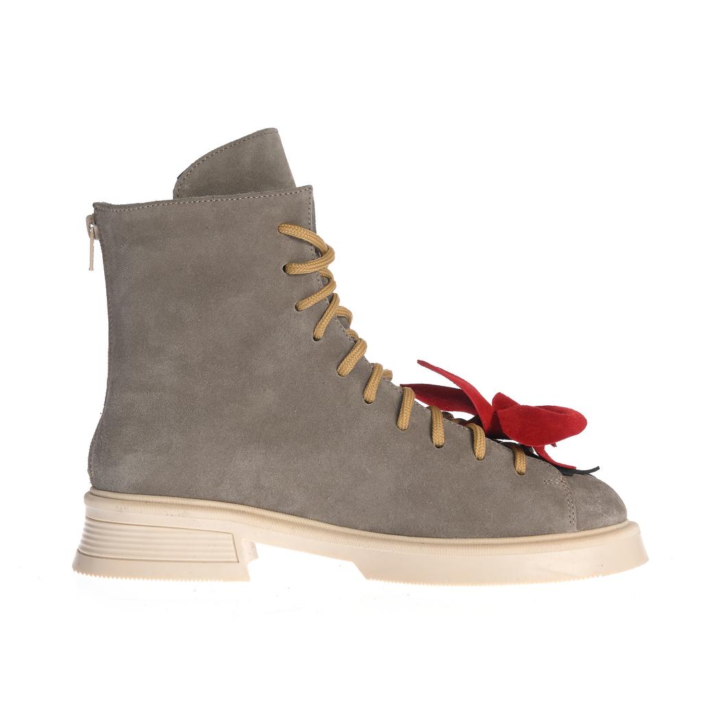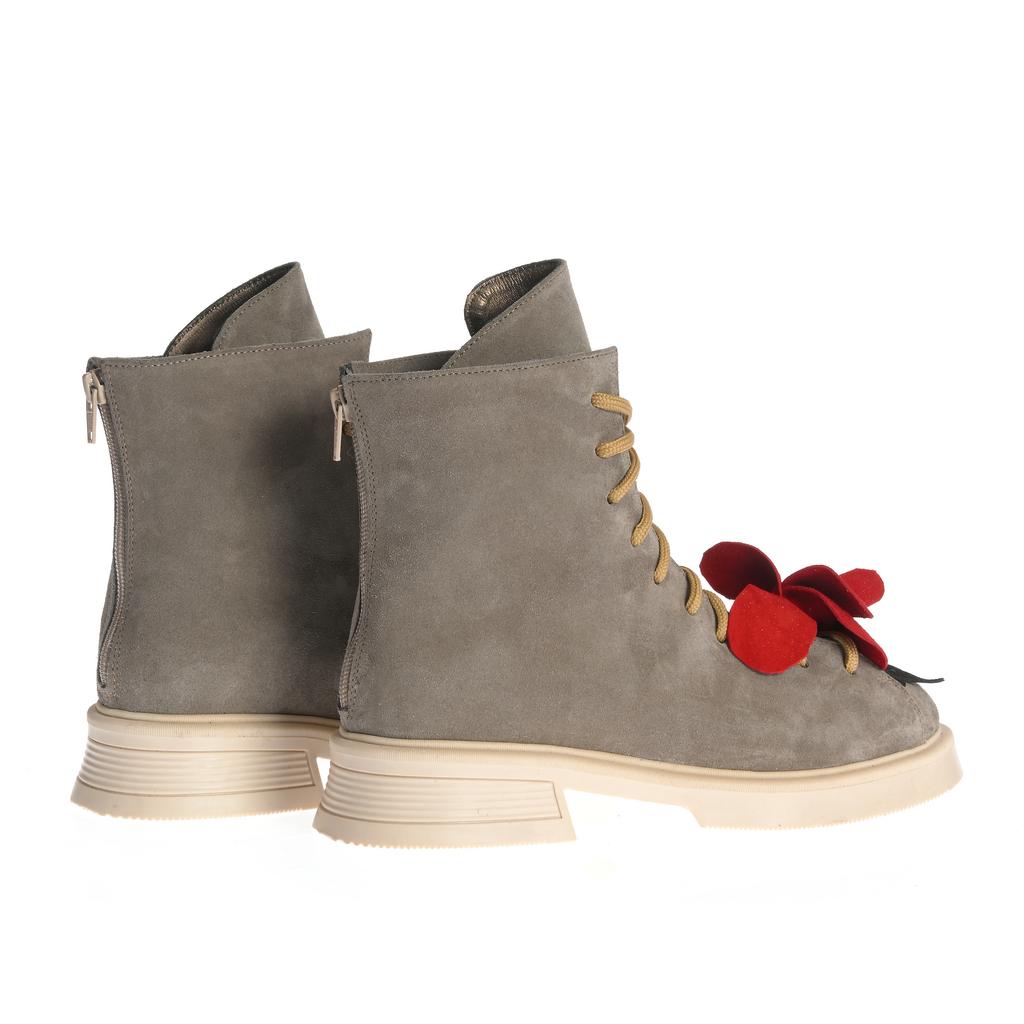 Aceste botine Ileana oferă un design elegant și feminin, confecționate integral din piele întoarsă gri, ideale pentru ocazii de modă. Talpa plată din cauciuc garantează stabilitate și confort pe întreaga zi, în timp ce sistemul de închidere combinat, cu șireturi și fermoar la spate, asigură o potrivire personalizată și acces rapid. Accesoriul decorativ distinctiv, o floare din material textil roșu și negru, adaugă un plus de stil și unicitate oricărei ținute. Acoperirea medie de gleznă face aceste botine versatile și ușor de integrat în garderoba ta urbană de zi cu zi.