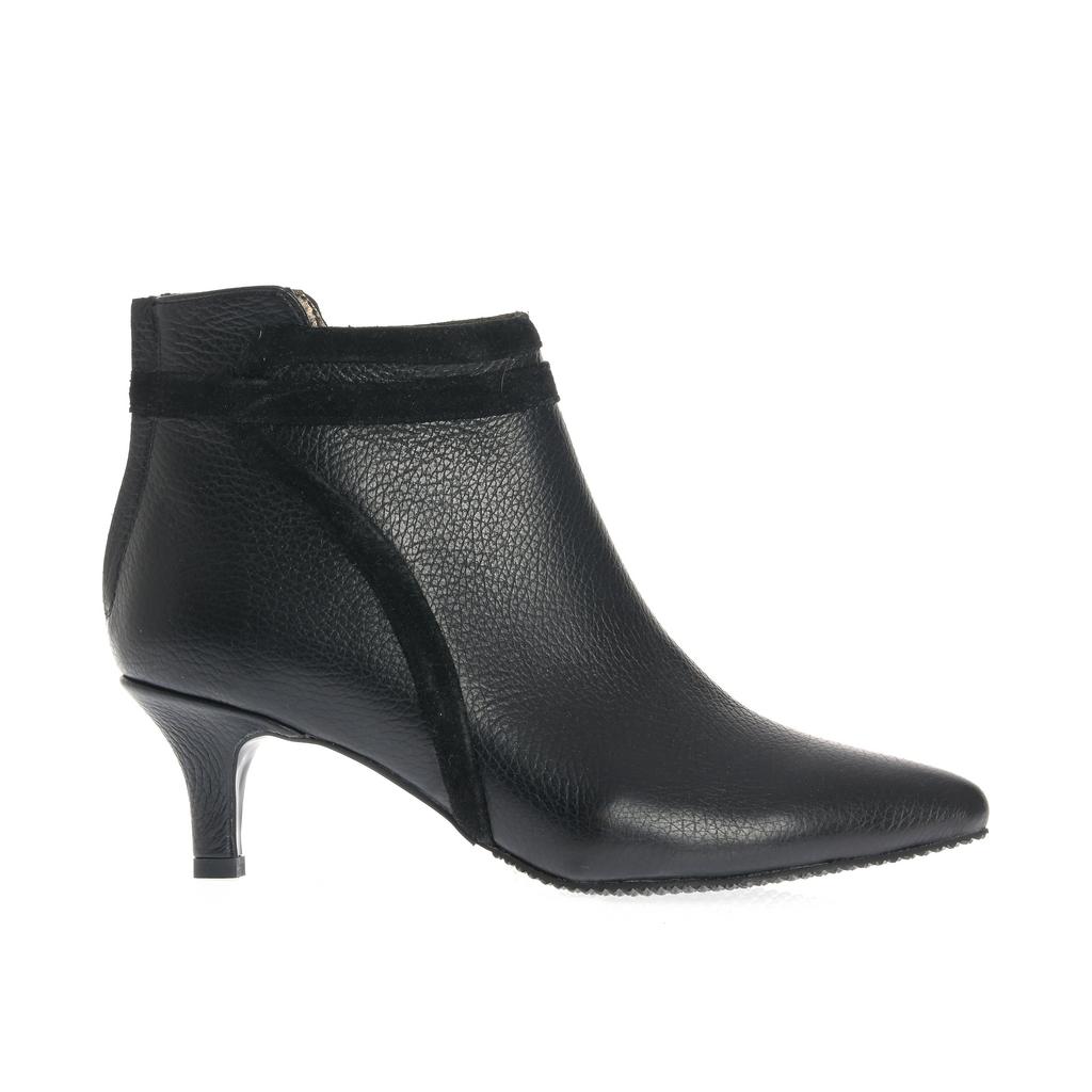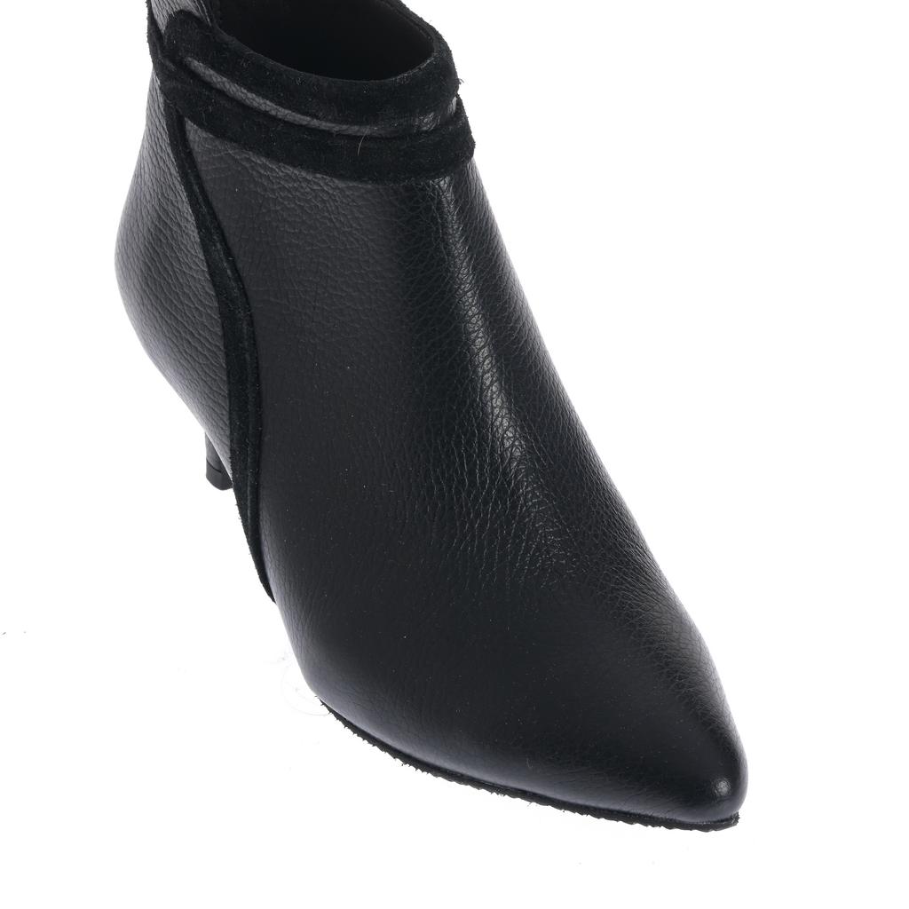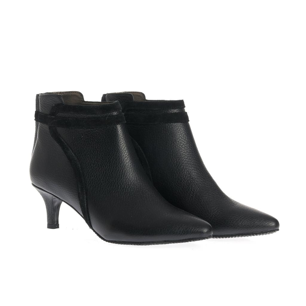 Botinele negre Ioana sunt realizate din piele și au un toc mic tip kitten confortabil. Se potrivesc perfect pentru un look elegant, având un design cu vârf ascuțit și detaliu decorativ din piele întoarsă.