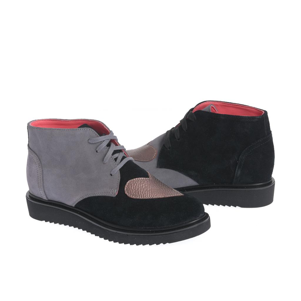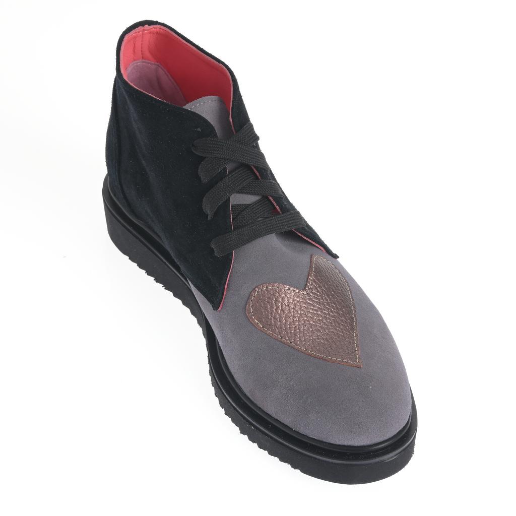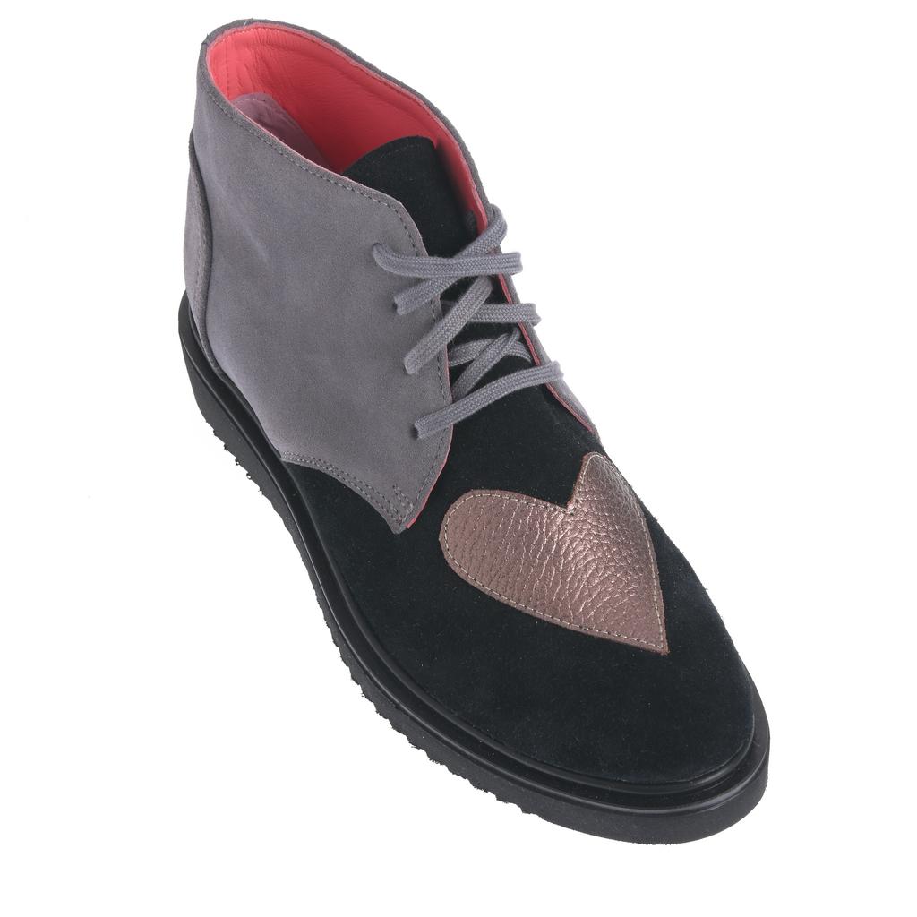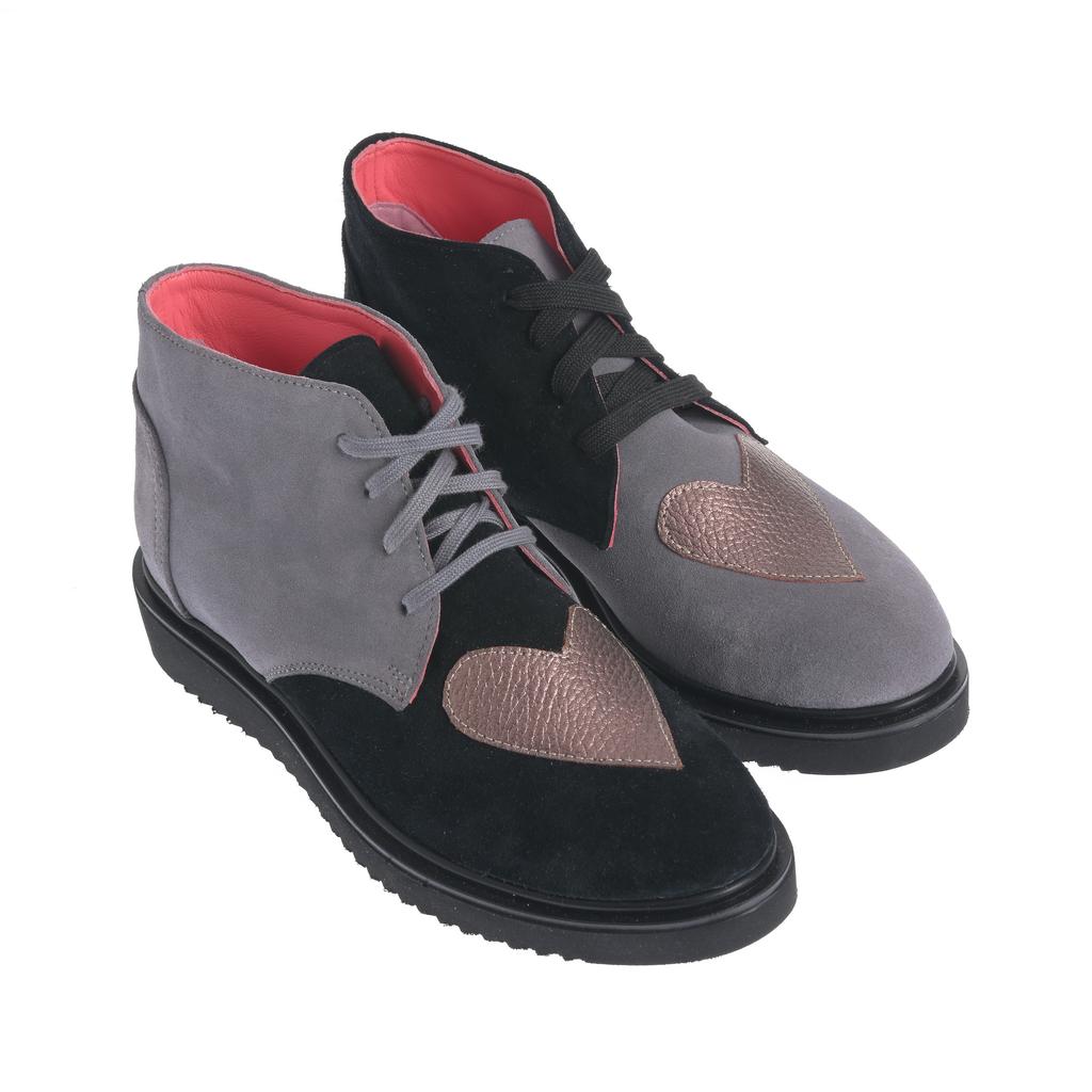 Botinele Medeea sunt alegerea ideală pentru un look modern și plin de stil, realizate din piele întoarsă de calitate în nuanțe de gri și negru, accentuate de un design metalic distinctiv în formă de inimă pe zona degetelor. Talpa plată din cauciuc, cu model zigzag, oferă stabilitate și confort la purtare. Designul cu șireturi și înălțimea medie la gleznă asigură o susținere perfectă, fiind potrivite pentru ținute fashion și urbane. Interiorul roșu adaugă un detaliu inedit și elegant acestor botine pentru femei.