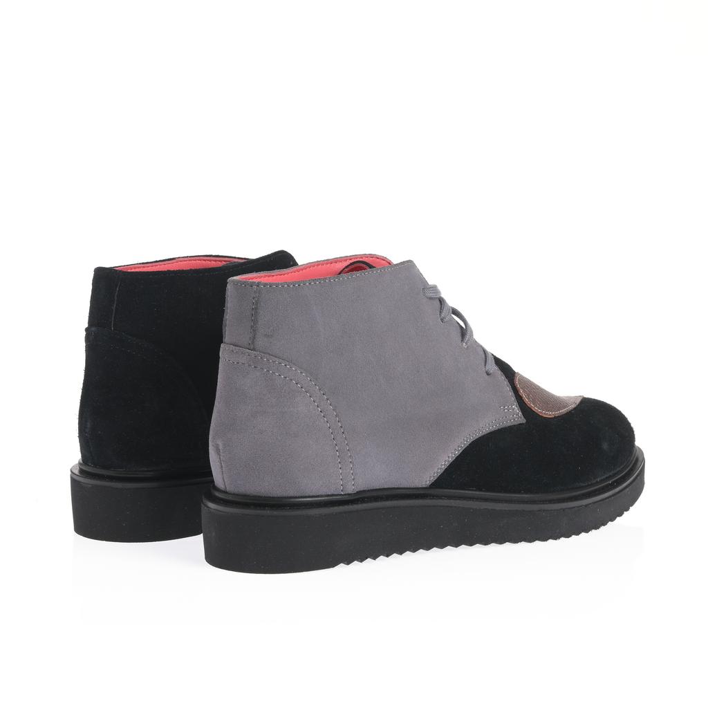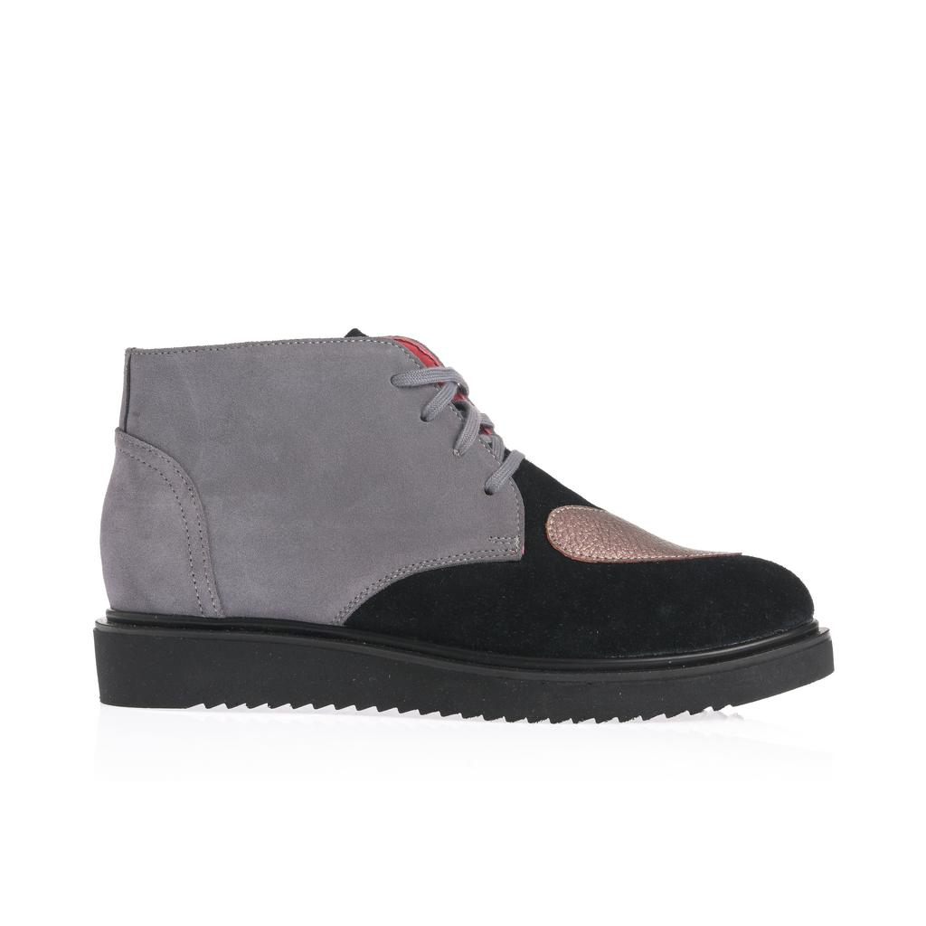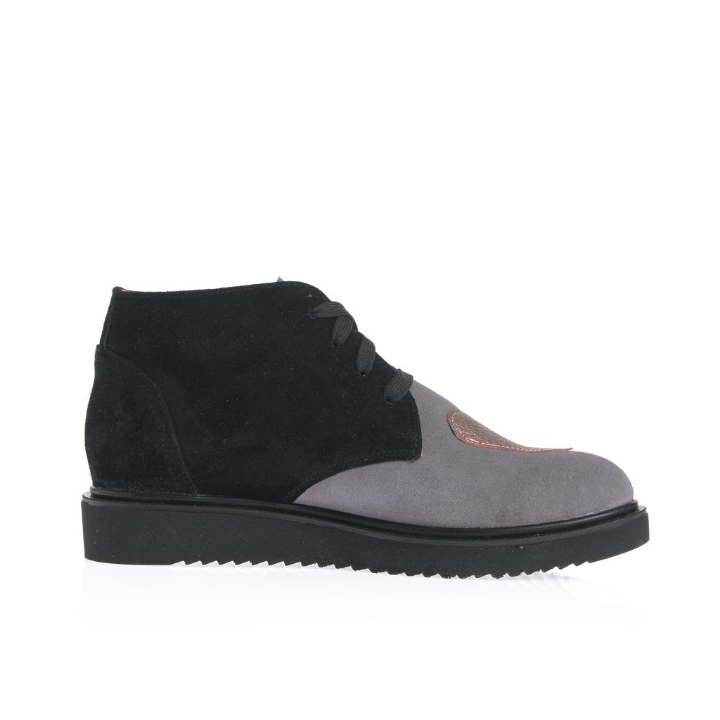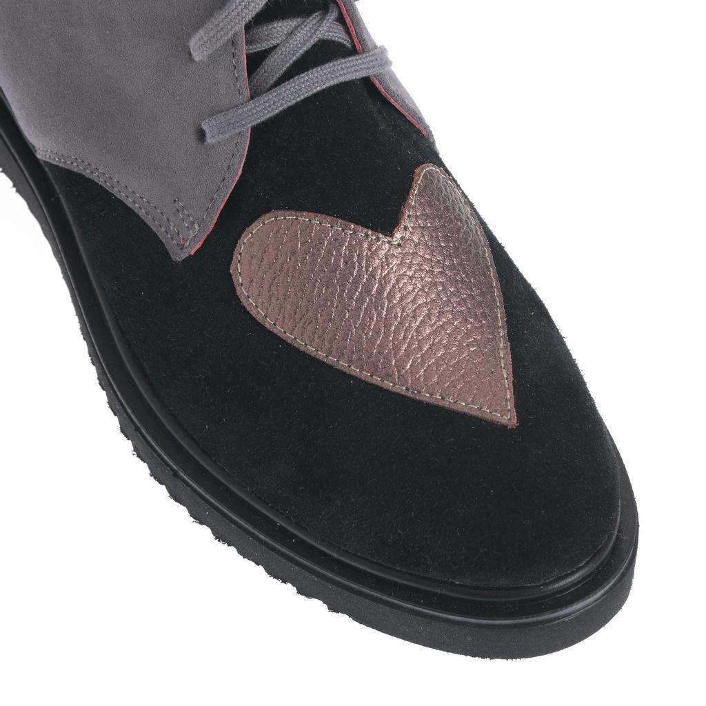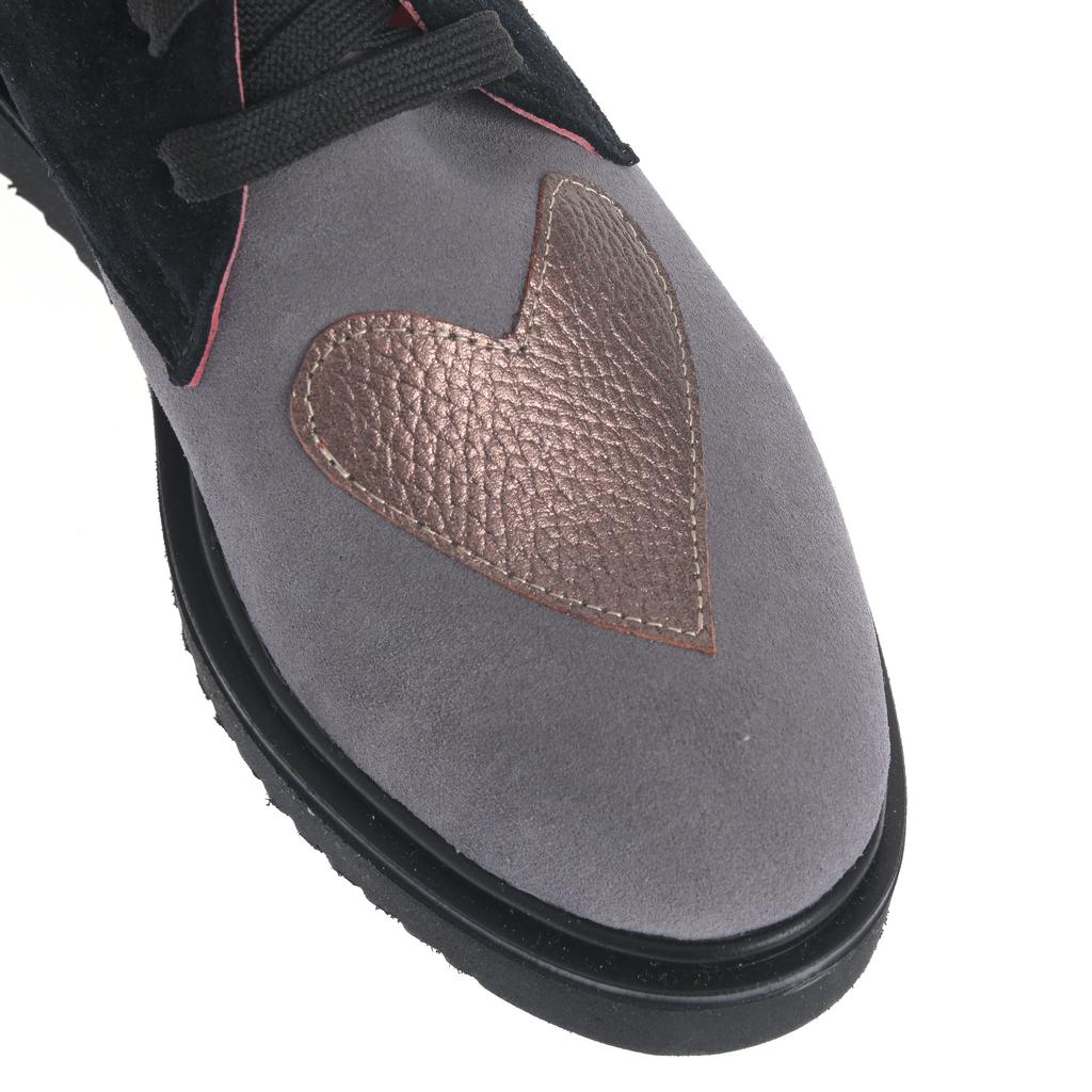 Botinele Medeea sunt alegerea ideală pentru un look modern și plin de stil, realizate din piele întoarsă de calitate în nuanțe de gri și negru, accentuate de un design metalic distinctiv în formă de inimă pe zona degetelor. Talpa plată din cauciuc, cu model zigzag, oferă stabilitate și confort la purtare. Designul cu șireturi și înălțimea medie la gleznă asigură o susținere perfectă, fiind potrivite pentru ținute fashion și urbane. Interiorul roșu adaugă un detaliu inedit și elegant acestor botine pentru femei.