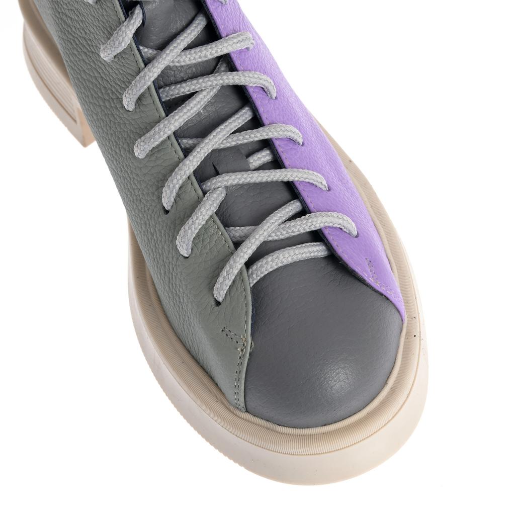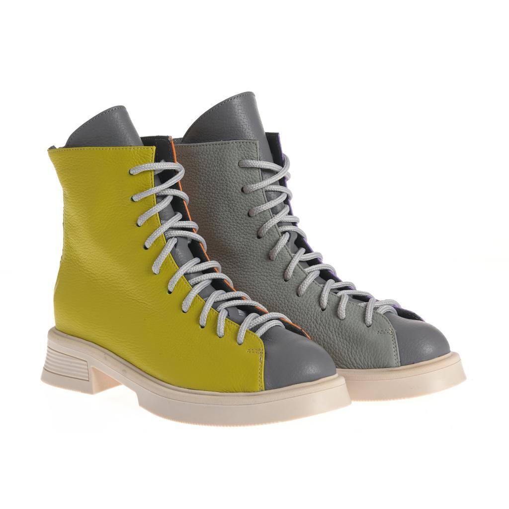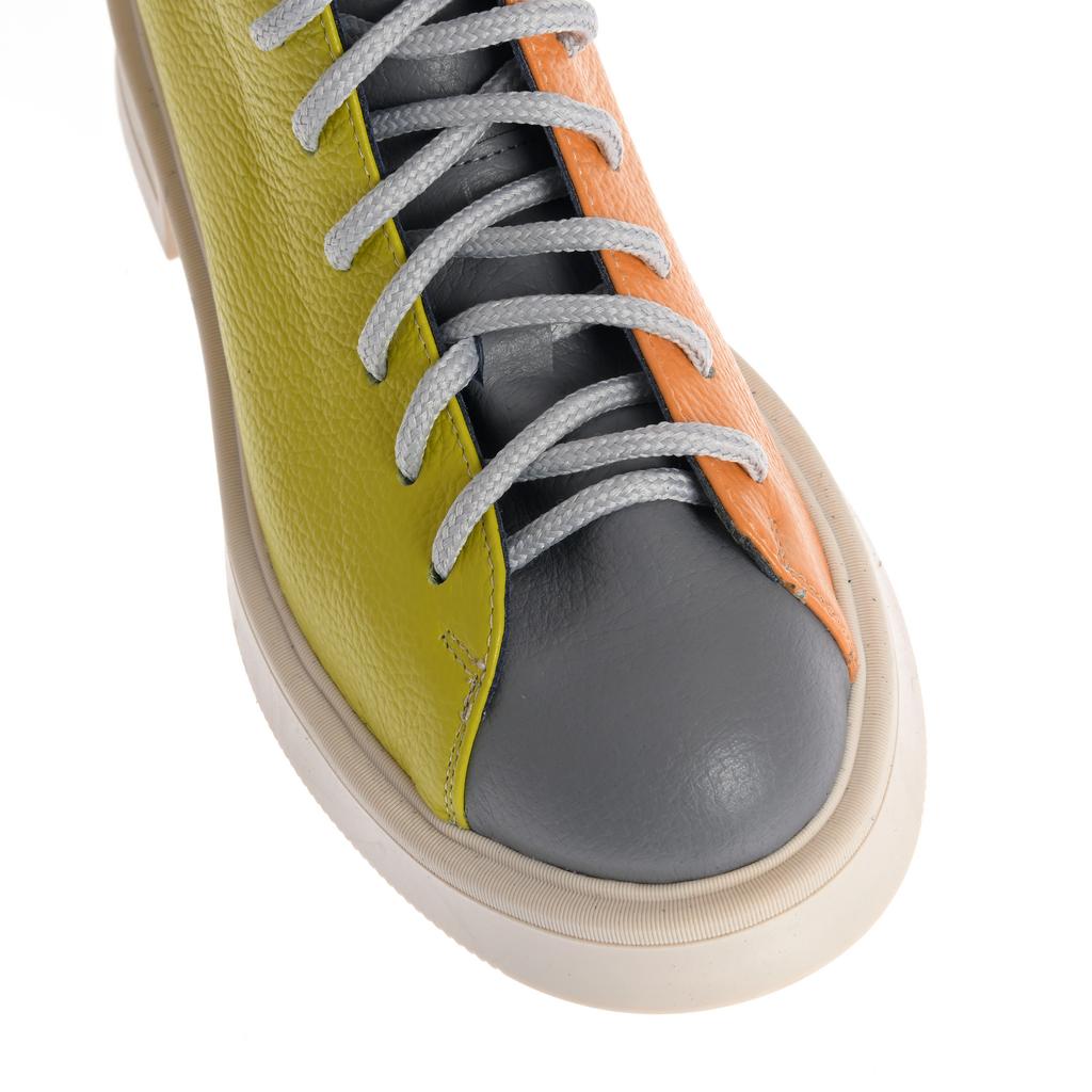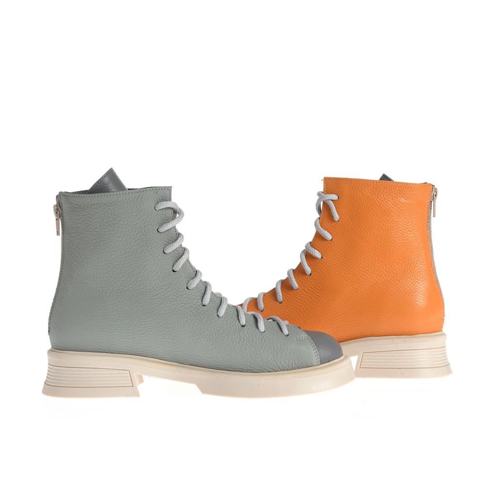 Aceste botine Raisa adaugă culoare și stil oricărei ținute datorită designului color block în nuanțe de gri și portocaliu. Confecționate din piele, oferă durabilitate și un aspect elegant, iar talpa plată de cauciuc asigură stabilitate pe suprafețe plane. Sistemul de închidere cu șireturi și fermoar la spate oferă o fixare sigură și ușurință în încălțare. Botinele au o formă rotunjită a vârfului și o talpă cu model minim vizibil, accentuând aspectul modern, ideal pentru ocazii fashion fără accent pe funcționalități speciale de confort sau rezistență la intemperii.