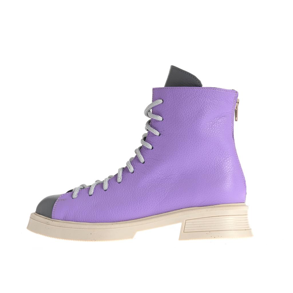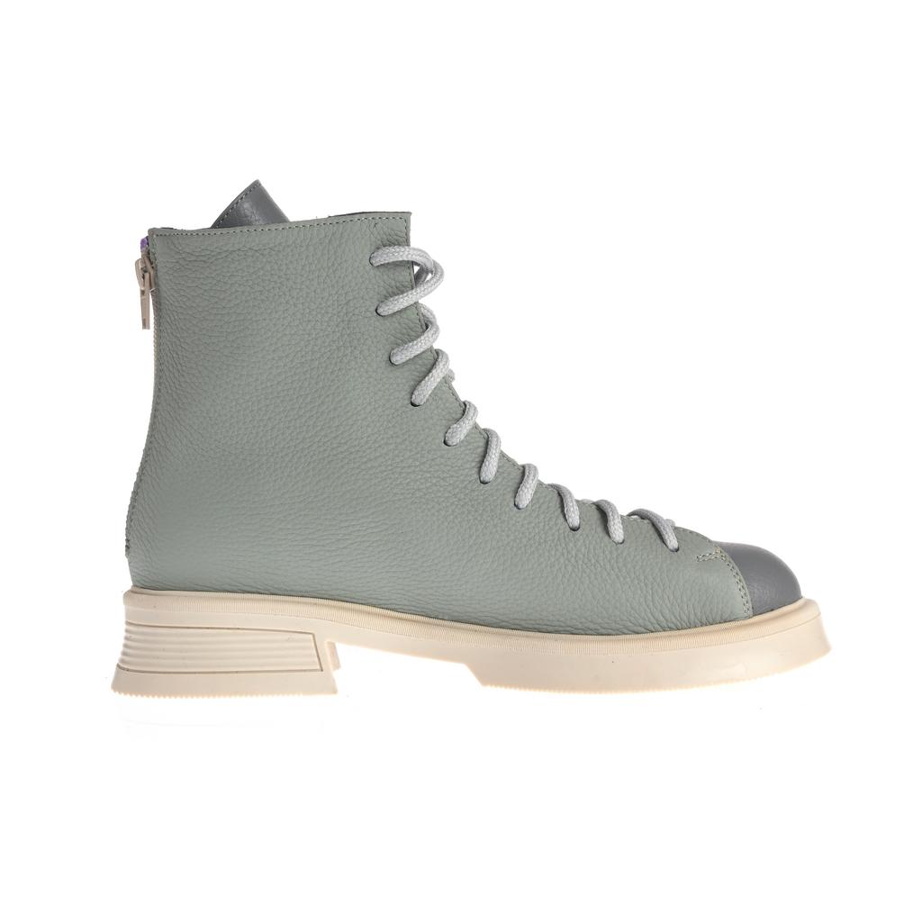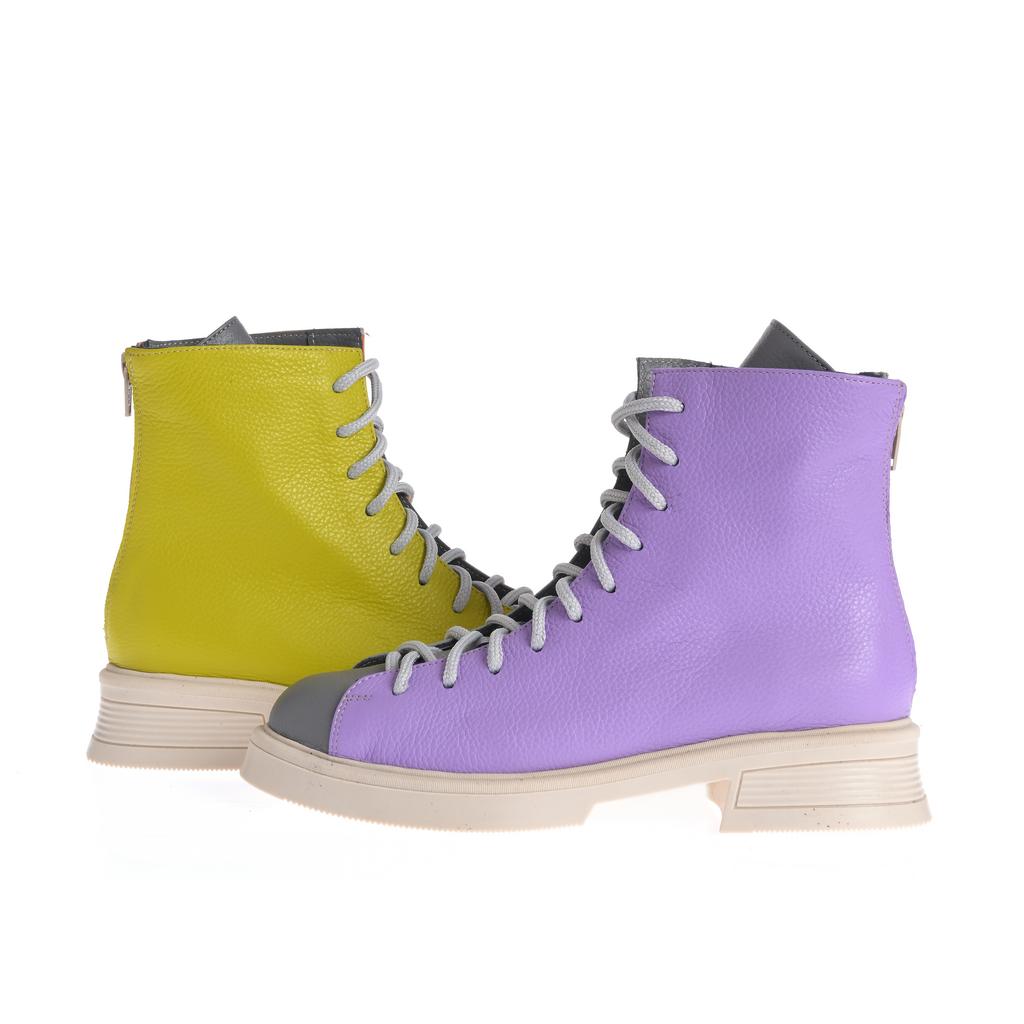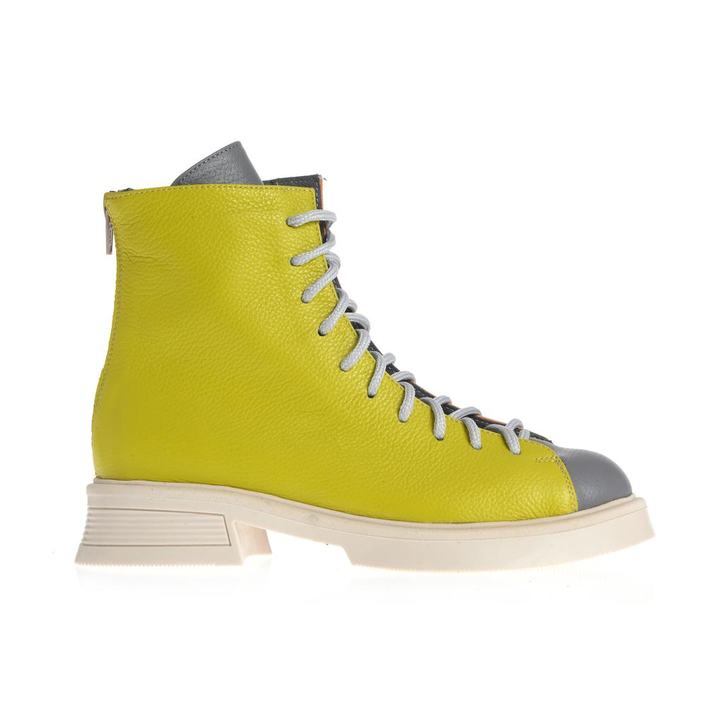 Aceste botine Raisa adaugă culoare și stil oricărei ținute datorită designului color block în nuanțe de gri și portocaliu. Confecționate din piele, oferă durabilitate și un aspect elegant, iar talpa plată de cauciuc asigură stabilitate pe suprafețe plane. Sistemul de închidere cu șireturi și fermoar la spate oferă o fixare sigură și ușurință în încălțare. Botinele au o formă rotunjită a vârfului și o talpă cu model minim vizibil, accentuând aspectul modern, ideal pentru ocazii fashion fără accent pe funcționalități speciale de confort sau rezistență la intemperii.
