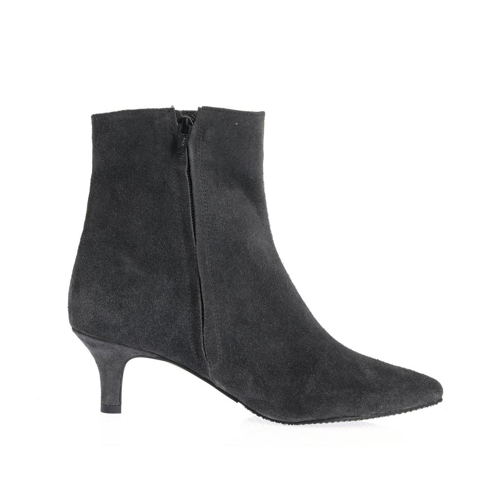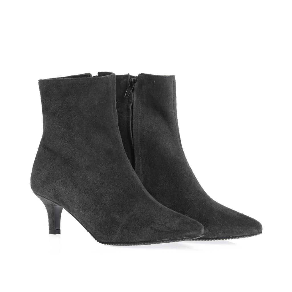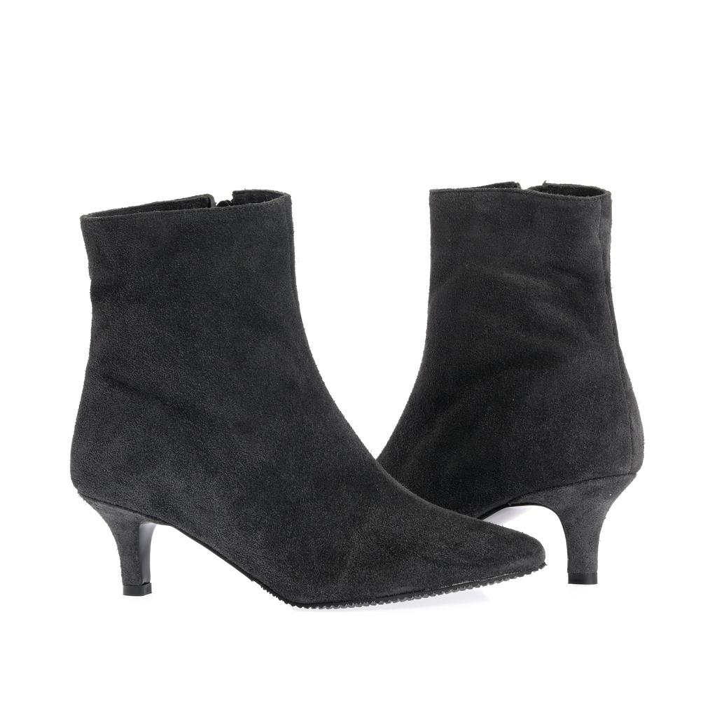 Botinele Roxana sunt realizate din piele intoarsă neagră de înaltă calitate, oferind un aspect sofisticat și o textură plăcută. Designul lor minimalist, cu varf ascutit și toc kitten mic, se potrivește perfect în ținutele fashion urbane, adăugând un plus de eleganță și feminitate. Închizătoarea cu fermoar asigură o fixare comodă și rapidă, în timp ce talpa subțire și flexibilă contribuie la un mers lejer. Cu o înălțime a gleznei care oferă susținere discretă, aceste botine sunt ideale pentru a fi purtate în diverse ocazii, completând armonios garderoba ta de iarnă sau toamnă. Culoarea neagră permite o asortare ușoară cu multiple combinații vestimentare.
