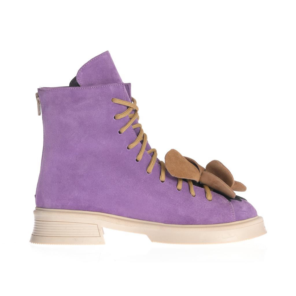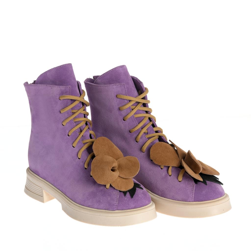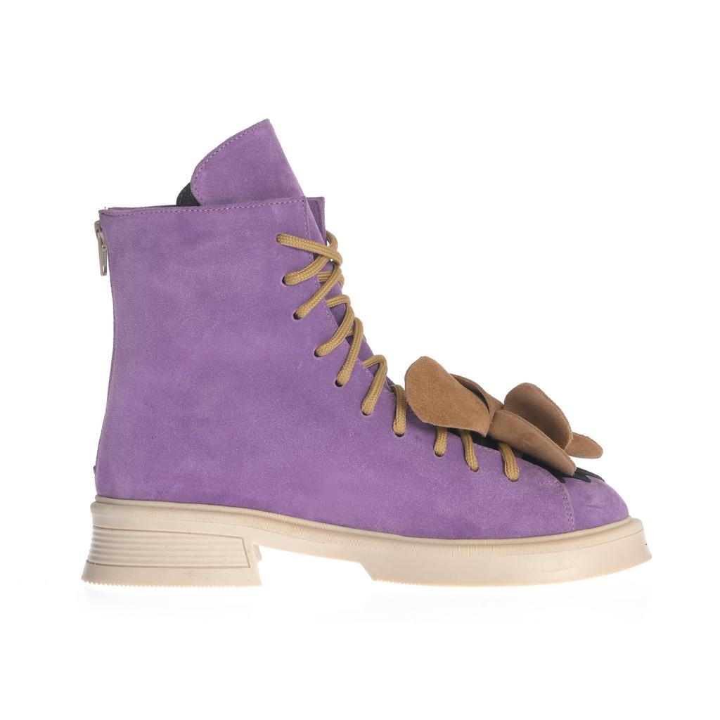 Botine fashion cu upper din piele intoarsă mov, șireturi maro și fermoare laterale pentru închidere facilă. Talpa este plată și realizată din cauciuc, cu un design confortabil și modern.