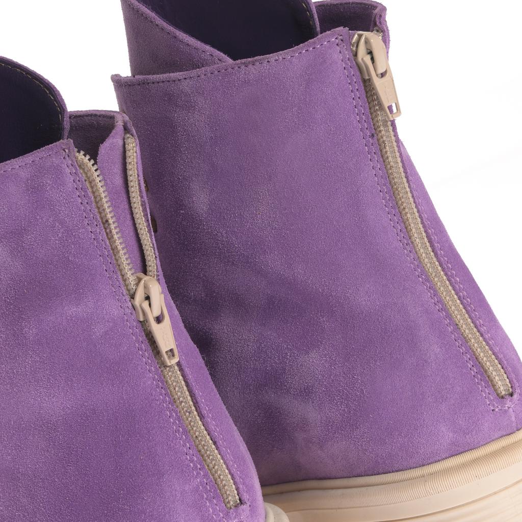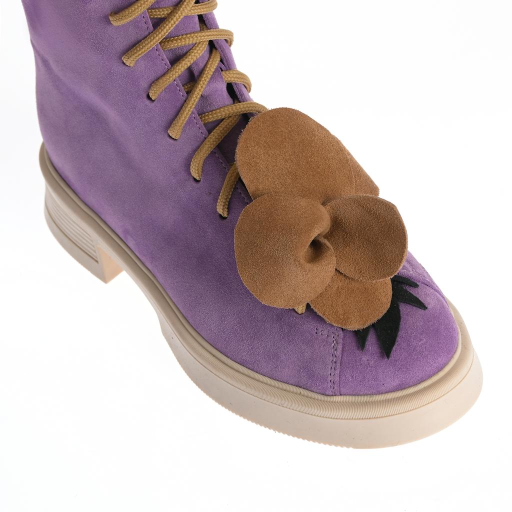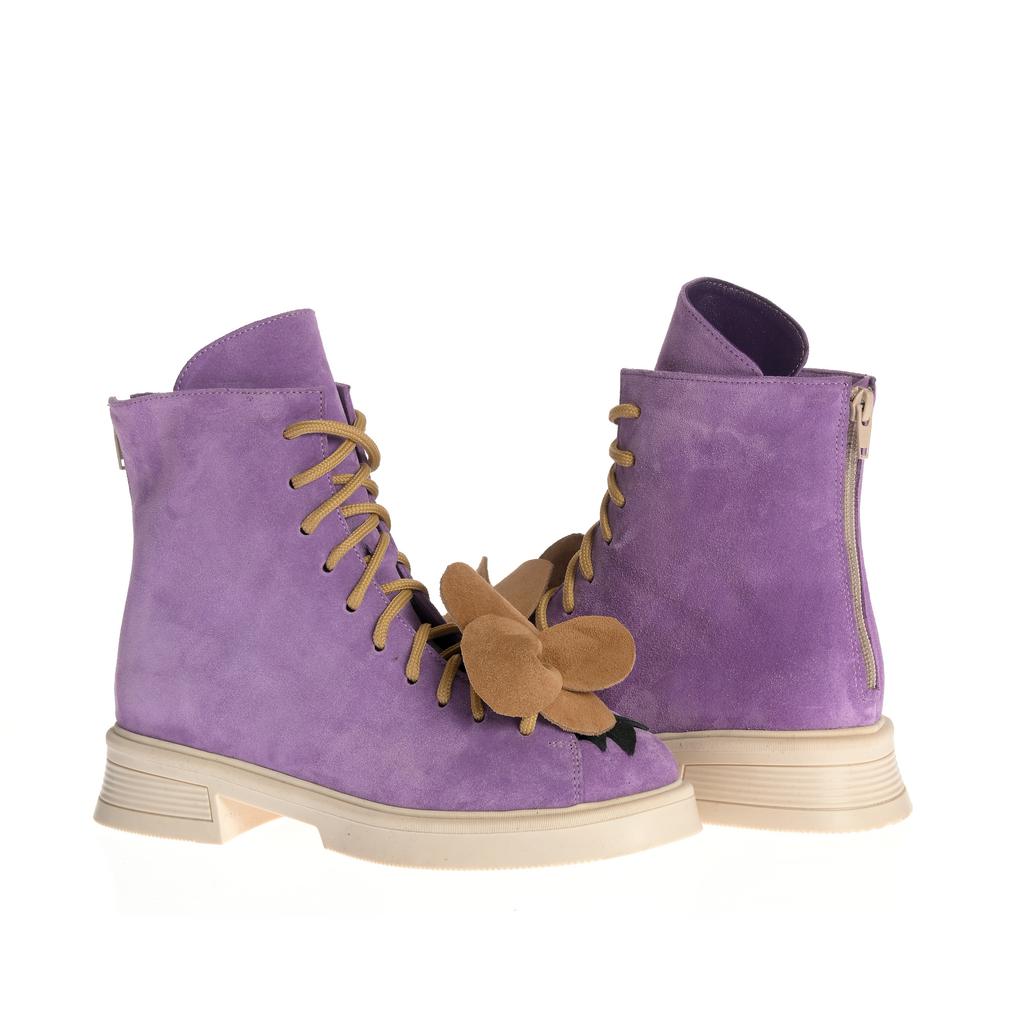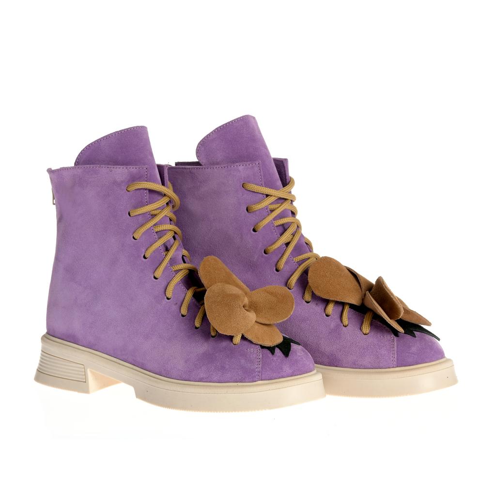 Botine fashion cu upper din piele intoarsă mov, șireturi maro și fermoare laterale pentru închidere facilă. Talpa este plată și realizată din cauciuc, cu un design confortabil și modern.