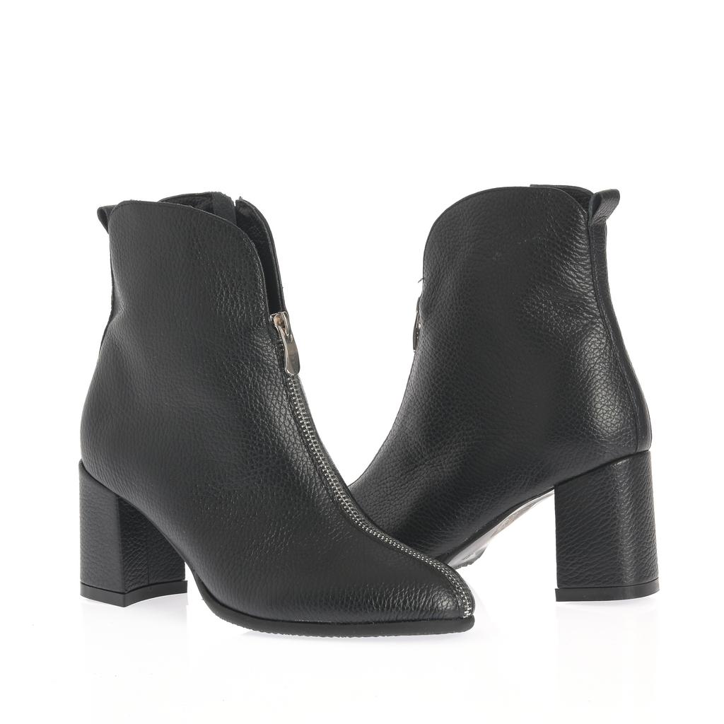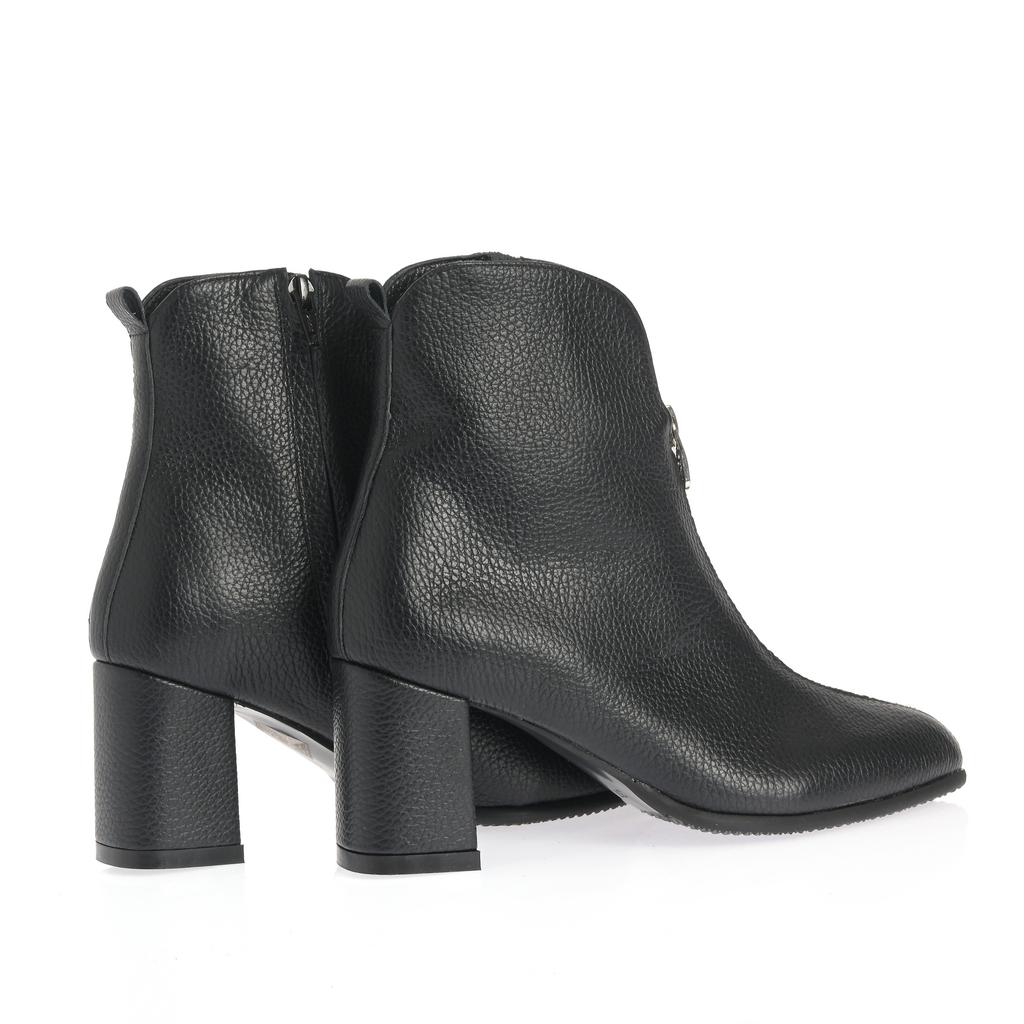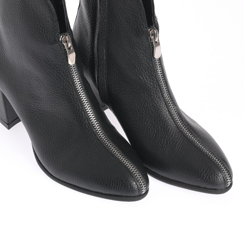 Botine de damă elegante, din piele texturată neagră, cu fermoar frontal și toc bloc de înălțime medie. Designul asigură o purtare confortabilă și un look modern pentru ținute casual stylish.