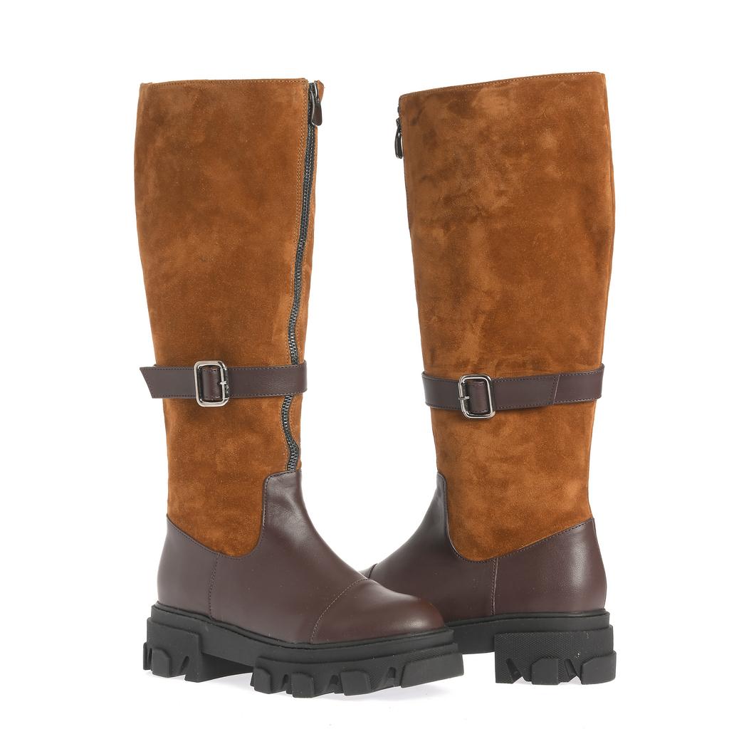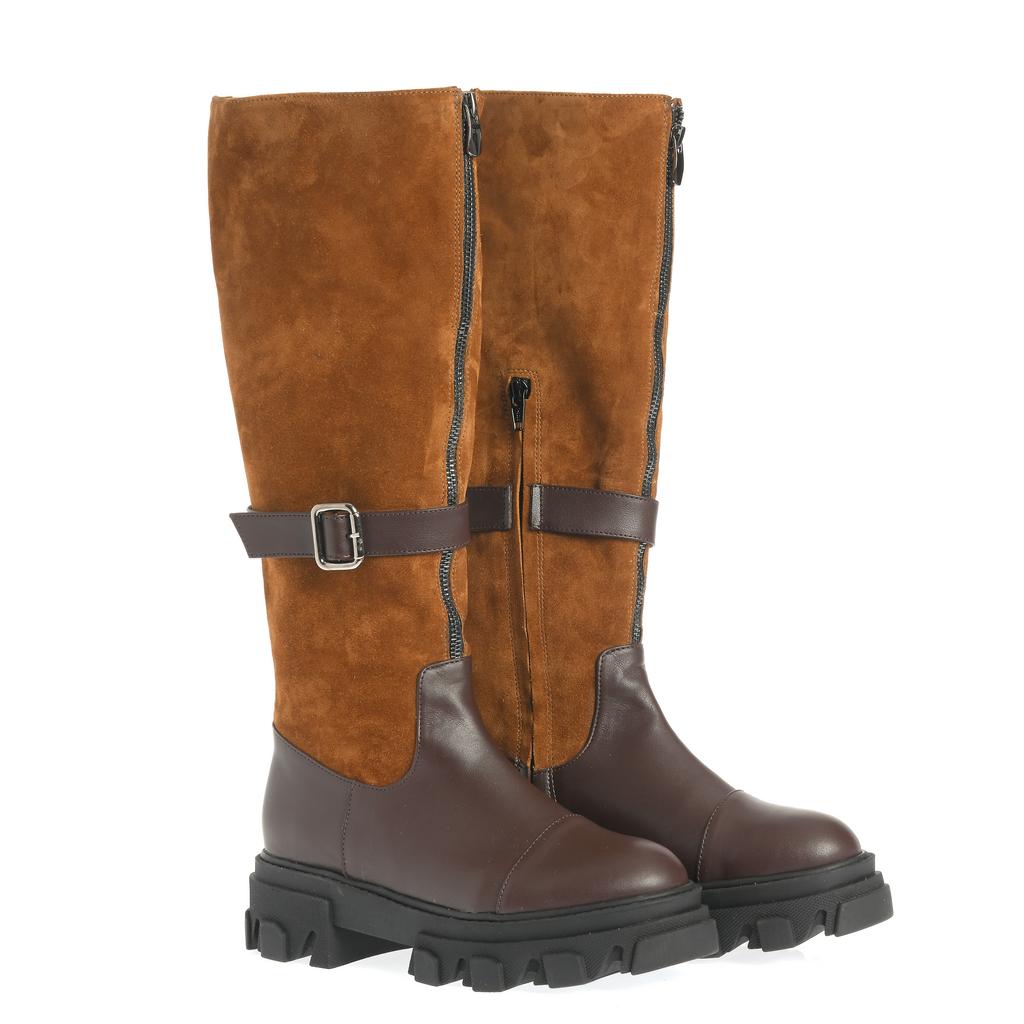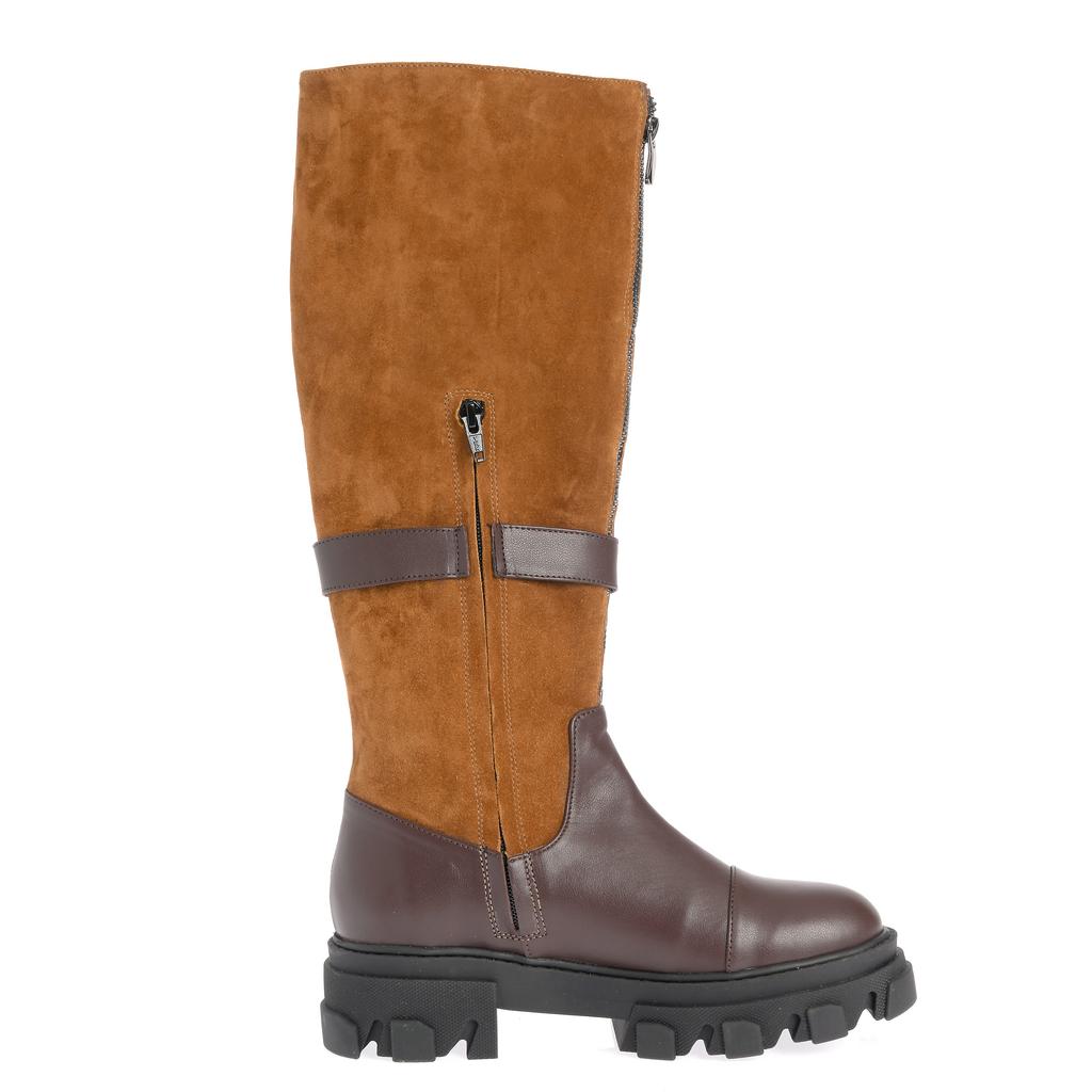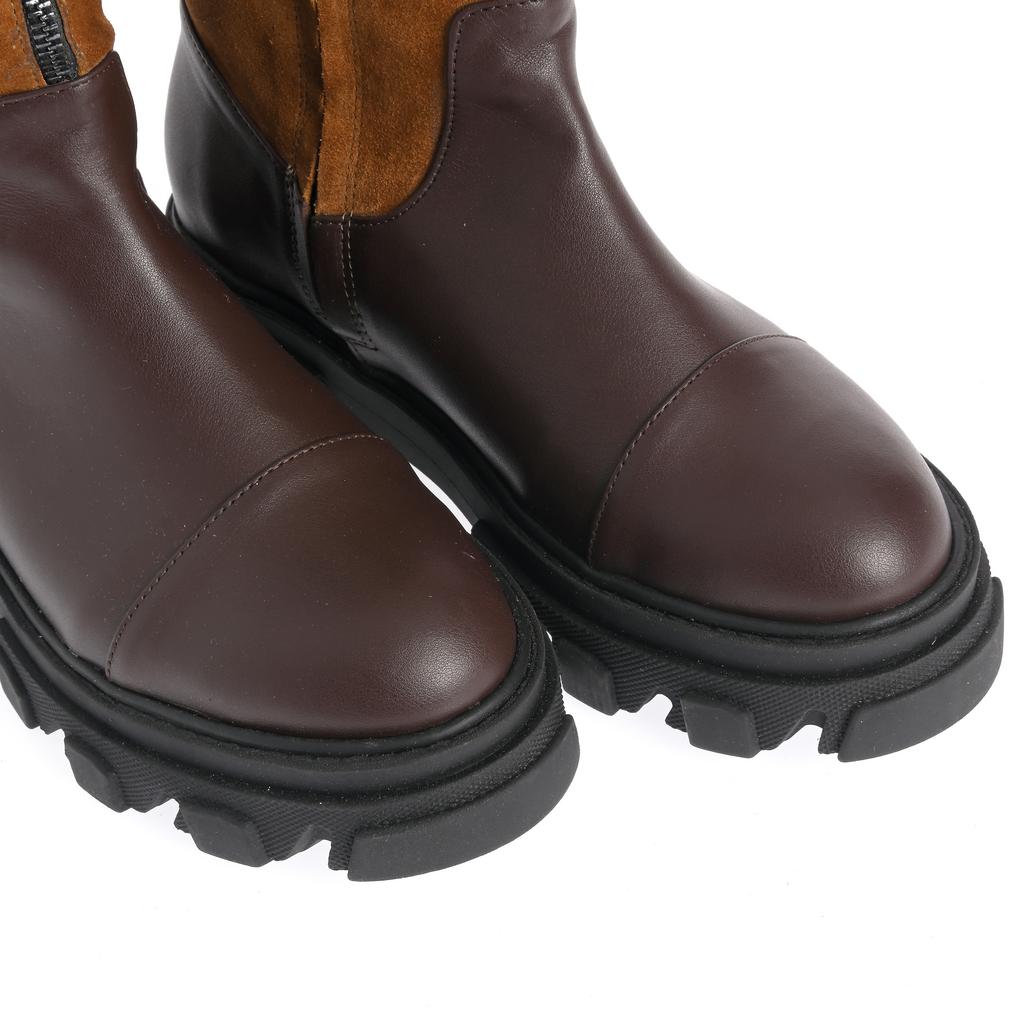 Aceste cizme cu talpa joasa Mara sunt realizate dintr-o combinație de piele maro și piele întoarsă camel, oferind un design versatil și modern, ideal pentru purtarea casual de zi cu zi. Talpa robustă din cauciuc, cu un profil lugged, garantează o tracțiune excelentă și rezistență sporită, iar forma rotundă a tălpii asigură confort în mers. Închiderea cu fermoar facilitează încălțarea rapidă și fixarea optimă pe gleznă înaltă. Detaliul cu curea de piele și cataramă adaugă un element decorativ subtil, fără a compromite confortul sau funcționalitatea. Aceste cizme sunt alegerea perfectă pentru cei care caută un compromis între stil și practicabilitate în ținutele casual.
