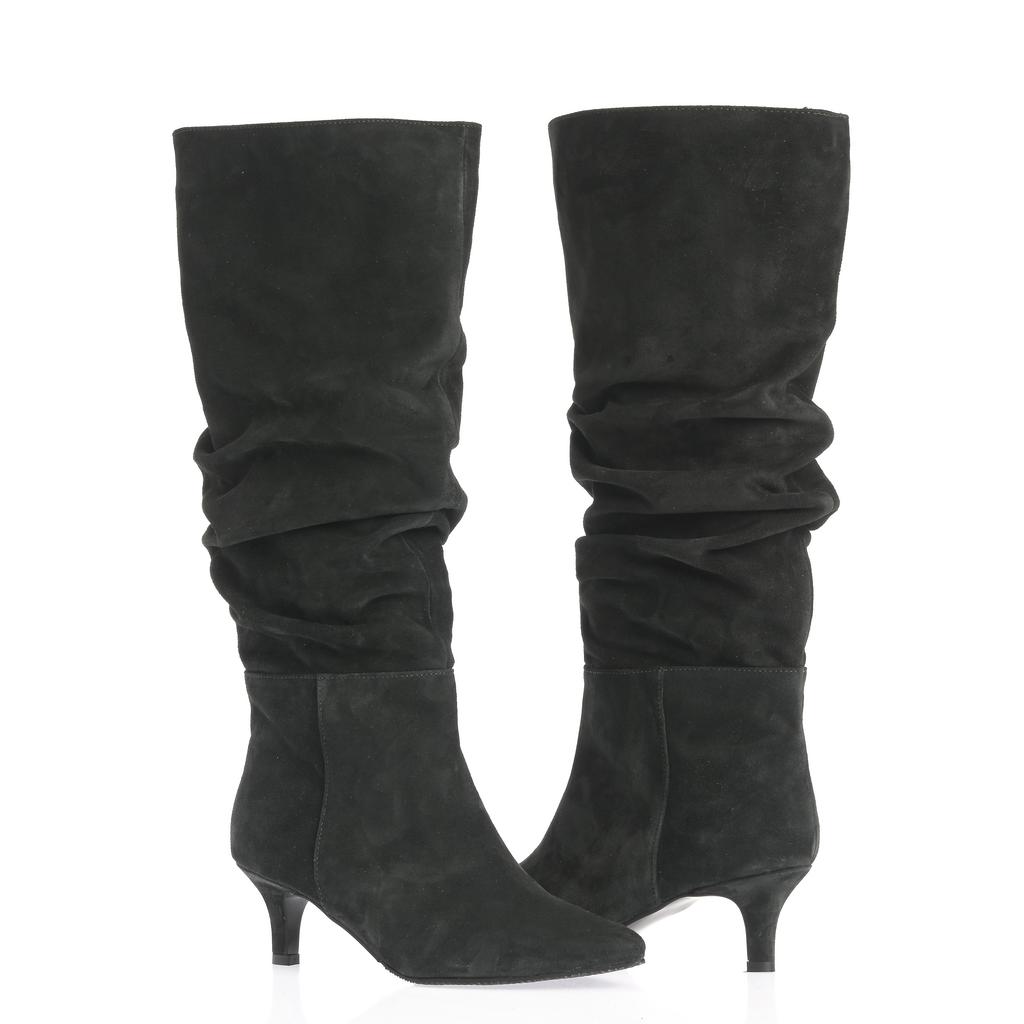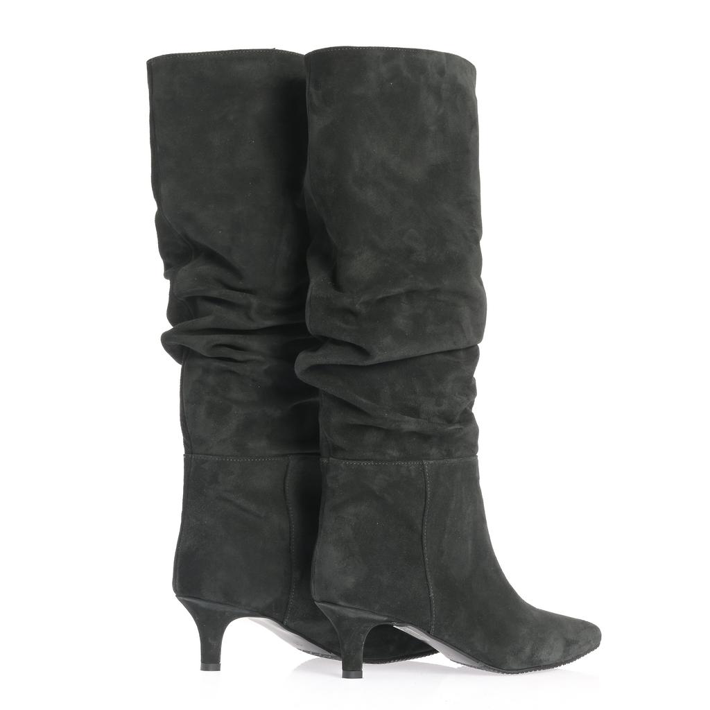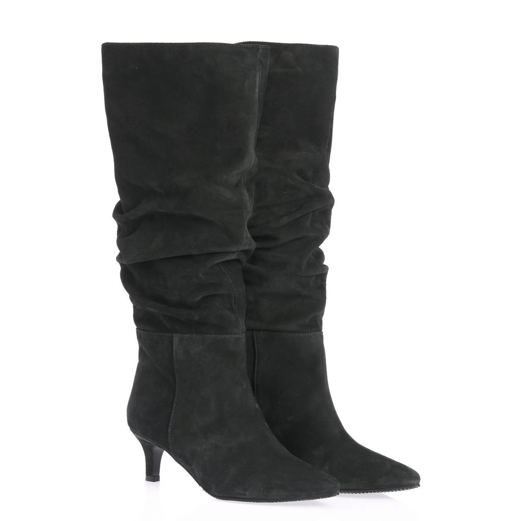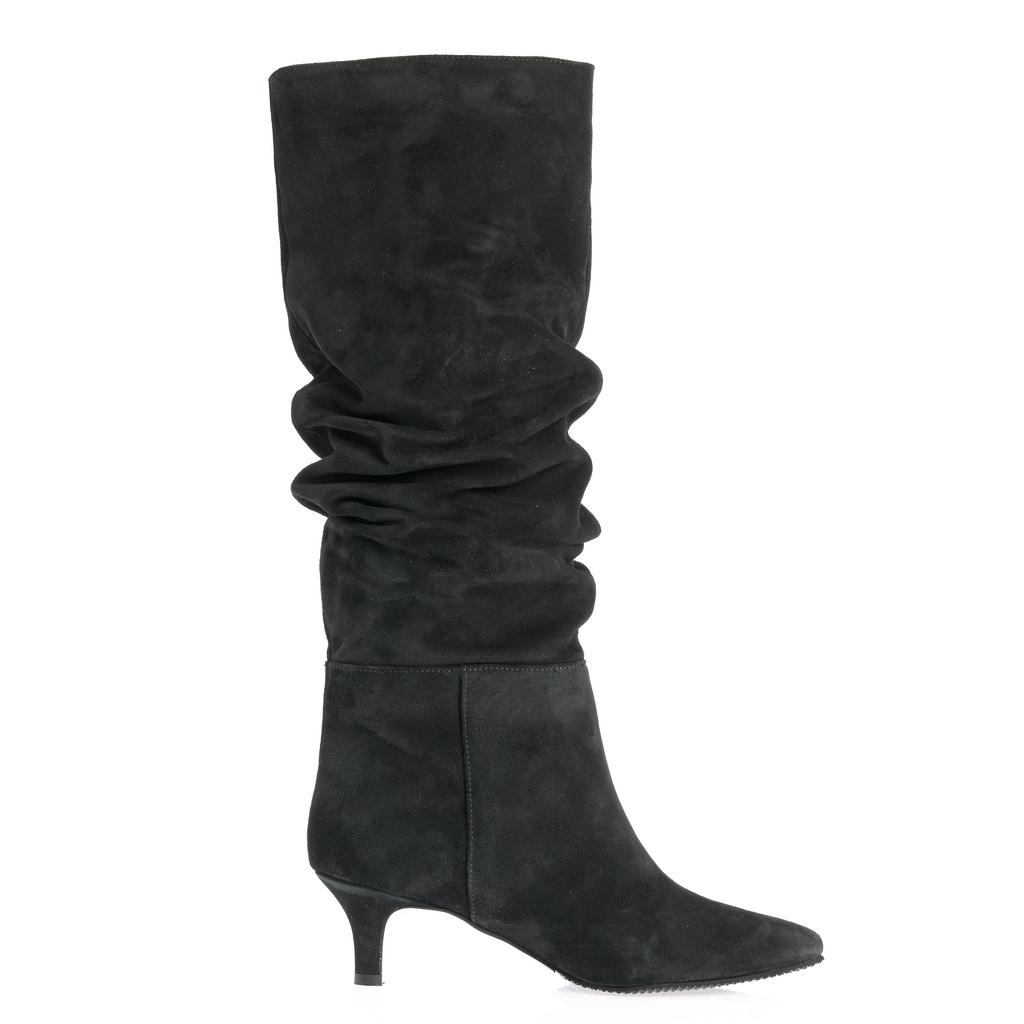 Aceste cizme fashion pentru femei, cu inaltime peste glezna, combină eleganta cu confortul. Materialul din piele intoarsa neagra confera un aspect sofisticat, iar varful ascutit adauga un plus de rafinament. Tocul kitten ofera inaltime fara a compromite confortul, iar sistemul slip-on permite o incaltare usoara si rapida. Talpa din cauciuc asigura aderenta, perfecte pentru iesiri casual elegante sau ocazii speciale. Cu un design minimalist, cu putine cusaturi vizibile, cizmele Ioana devin un element esential in garderoba ta de toamna si iarna.