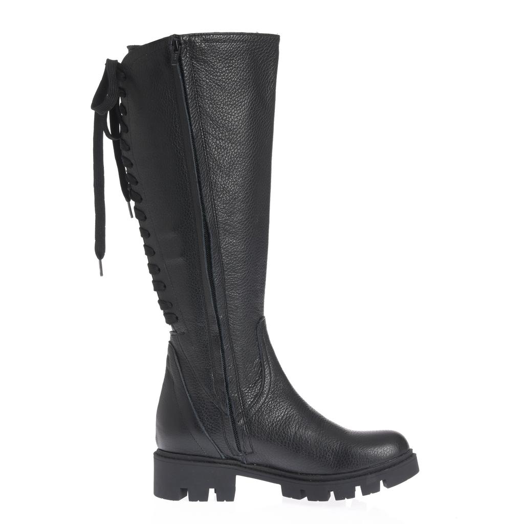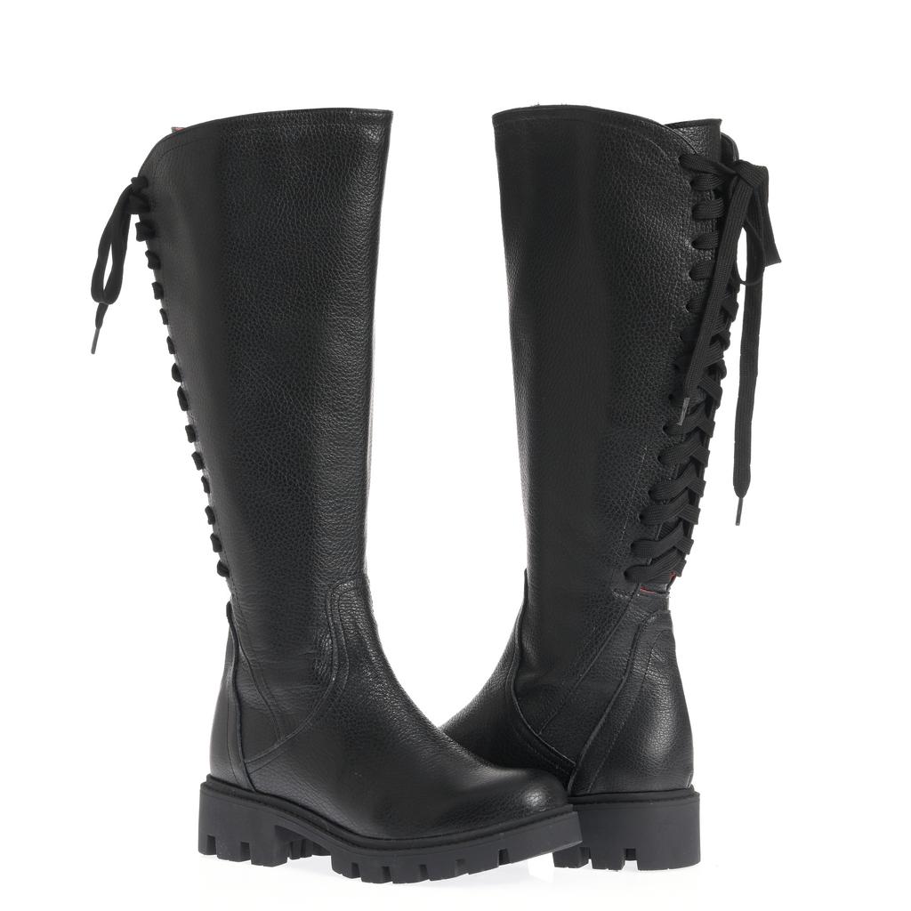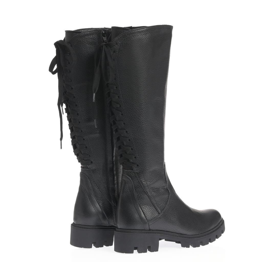 Cizmele Sorina sunt realizate din piele neagră cu talpă groasă și aderentă. Designul lor include șireturi elegante pe spate și fermoar lateral pentru o potrivire ușoară și ajustabilă. Tocul jos și vârful rotund conferă confort și stil în fiecare zi.