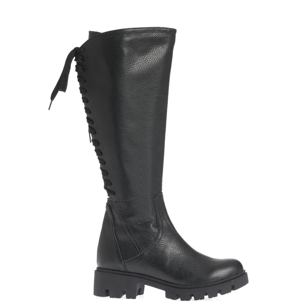 Aceste cizme cu toc Sorina combină un aspect modern cu funcționalitatea, oferind acoperire înaltă până la genunchi. Fabricația din piele neagră și talpa groasă din cauciuc asigură stabilitate, aderență ridicată și confort pe durata purtării. Sistemul de închidere cu șireturi la spate, legate în partea superioară, alături de fermoarul lateral, facilitează ajustarea și îmbrăcarea rapidă. Designul cu toc jos în bloc și vârf rotund conferă un look casual și trendy, perfect pentru ținute de zi cu zi în condiții de vreme ușor umedă. Lipsa elementelor vizibile de brand sau logo și cusăturile vizibile completează un stil elegant și durabil.