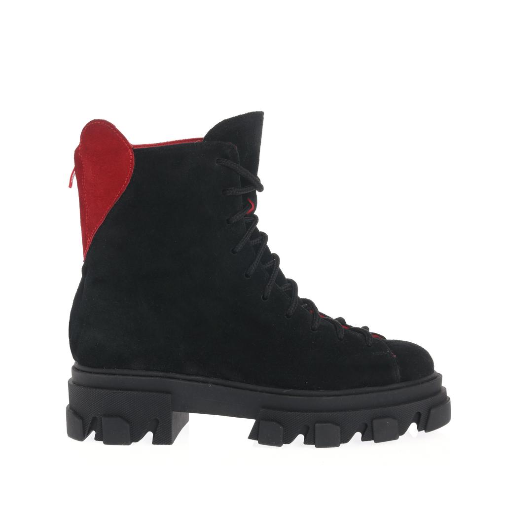 Ghetele Larisa se remarcă prin combinația elegantă de negru și roșu pe piele întoarsă, având talpă groasă din cauciuc cu crampoane pentru aderență sporită. Închidere cu șiret și fermoar lateral, oferind confort și stil urban.