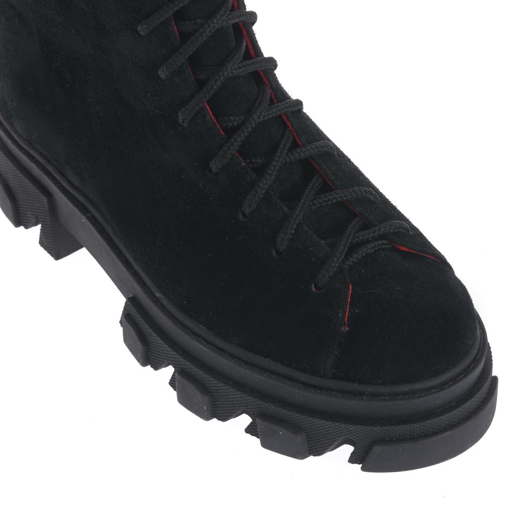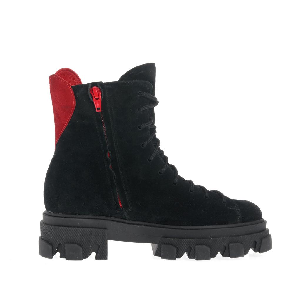 Ghetele Larisa sunt confecționate din piele întoarsă neagră, cu accente roșii distinctive la toc și fermoar, ce adaugă un plus de personalitate. Talpa groasă din cauciuc, prevăzută cu un model crampoane, asigură tracțiune optimă și rezistență sporită, fiind ideale pentru utilizare în oraș. Designul cu închidere duală, șireturi combinate cu fermoar lateral, facilitează încălțarea rapidă și ajustarea perfectă pe picior. Forma rotundă a vârfului și înălțimea medie a gleznei oferă un echilibru ideal între confort și protecție, fiind potrivite pentru un look casual-fashion modern.