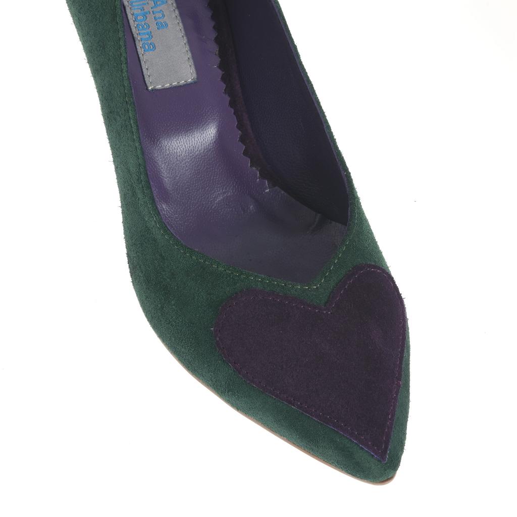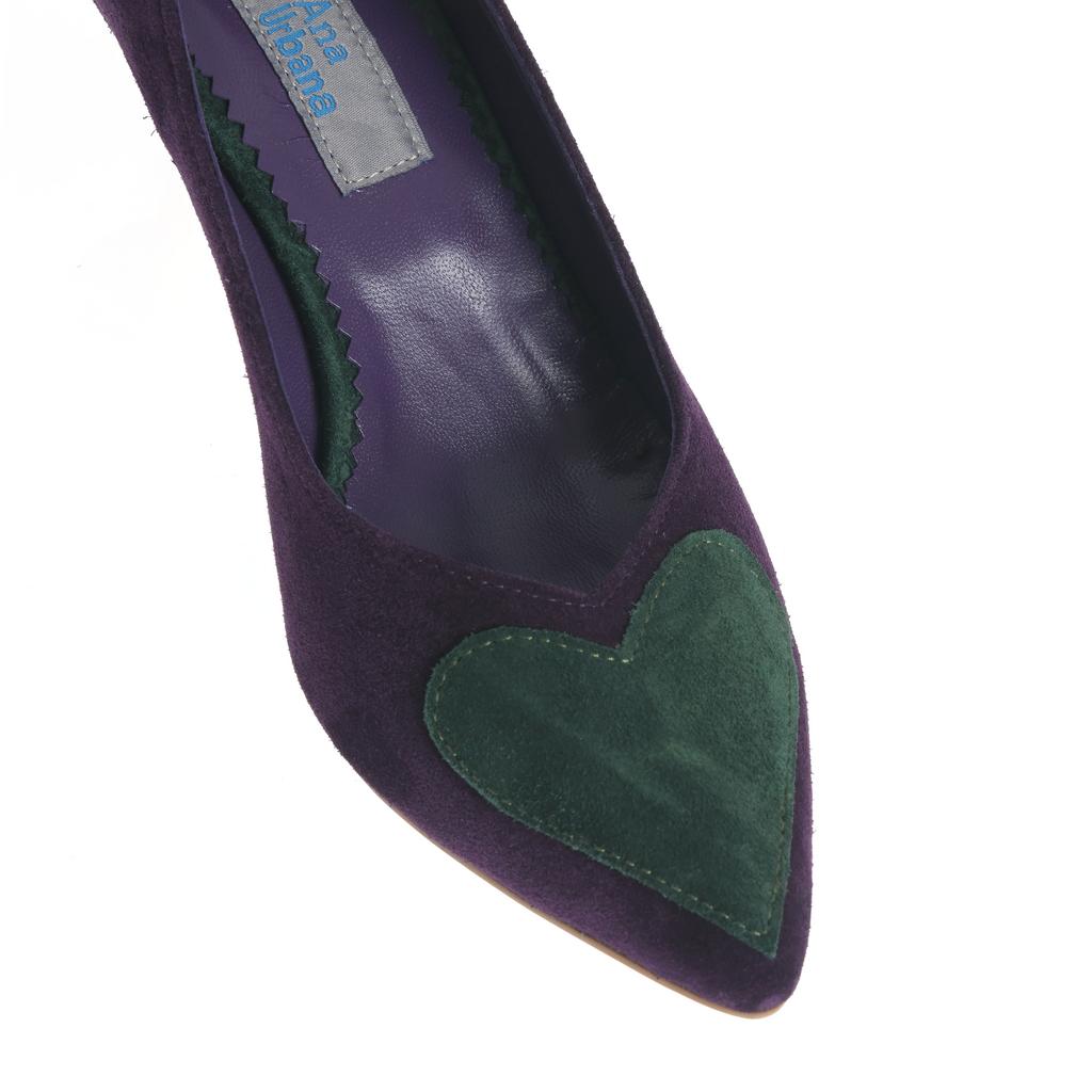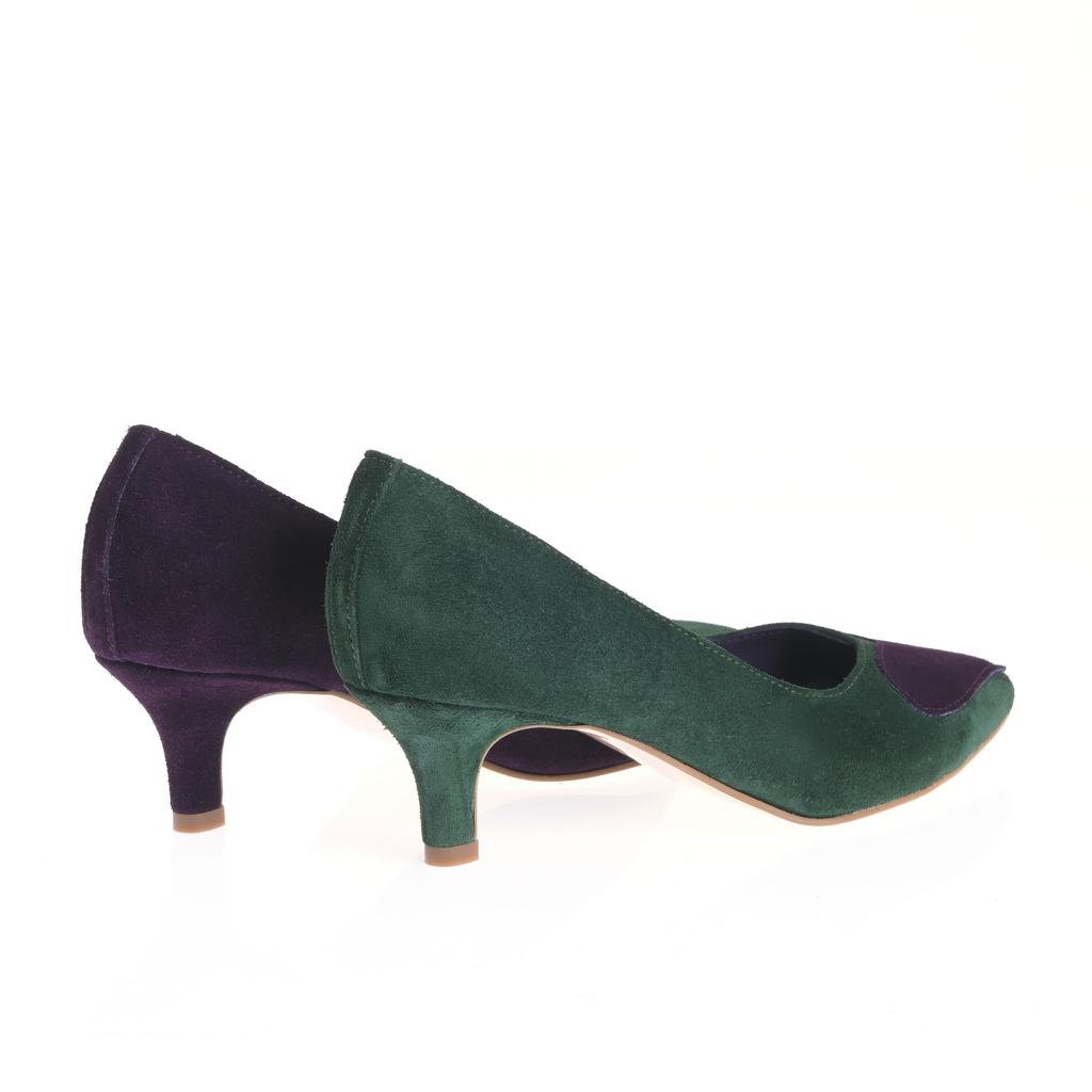 Pantofii Alessia combina stilul si confortul prin utilizarea materialului din piele intoarsa in nuante contrastante de verde si mov. Tocul mic de tip kitten si talpa plata din piele ofera stabilitate si usurinta in purtare, iar varful ascutit adauga un aspect rafinat. Designul slip-on faciliteaza incaltarea rapida, iar patch-ul decorativ in forma de inima impreuna cu cusaturile vizibile aduc un plus de personalitate. Acesti pantofi sunt ideali pentru ocazii fashion unde doriti sa iesiti in evidenta cu un accesoriu chic si comfortabil.