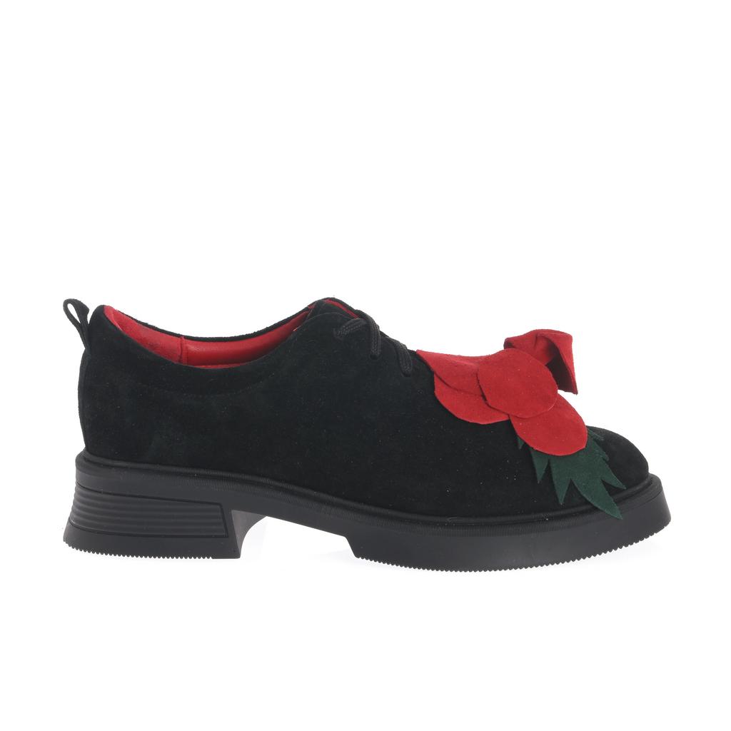 Pantofi Oxford de damă cu design elegant, confecționați din piele întoarsă neagră cu aplicație florală roșie. Talpa de cauciuc și căptușeala căptușită asigură confort sporit pentru purtare zilnică. Tocul jos și forma rotundă conferă un plus de stil casual.