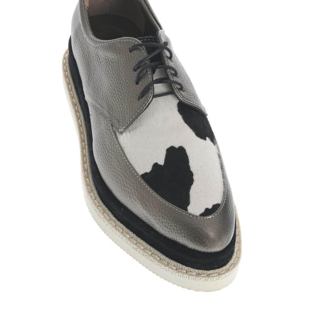 Pantofi Oxford damă din piele metalizată texturată și model piele vacă, ideali pentru ținutele fashion. Talpa plată din cauciuc oferă confort pe tot parcursul zilei, iar sistemul de închidere cu șireturi asigură o fixare perfectă.