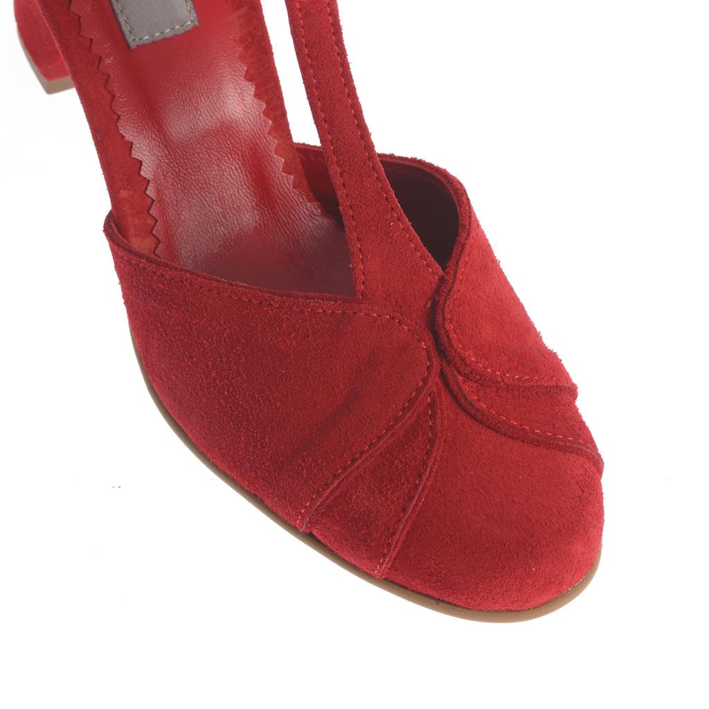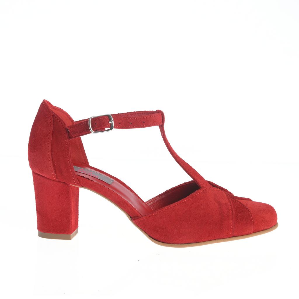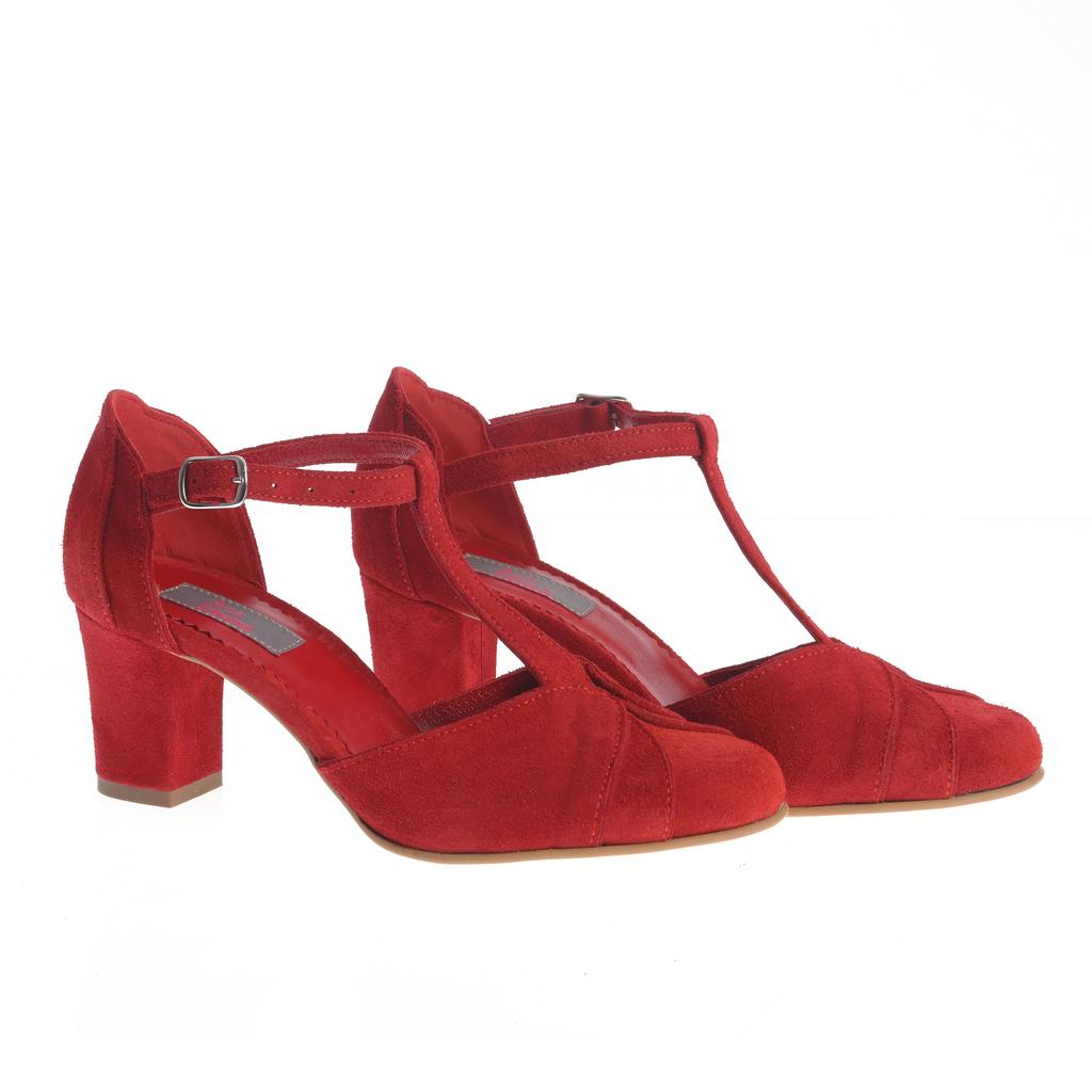 Pantofi roșii Zamfira cu toc gros mediu, din material suede cu închidere prin curea cu cataramă. Talpa de cauciuc asigură stabilitate, iar designul cu vârf rotund și cusături vizibile oferă un aspect elegant și modern.
