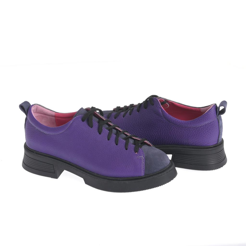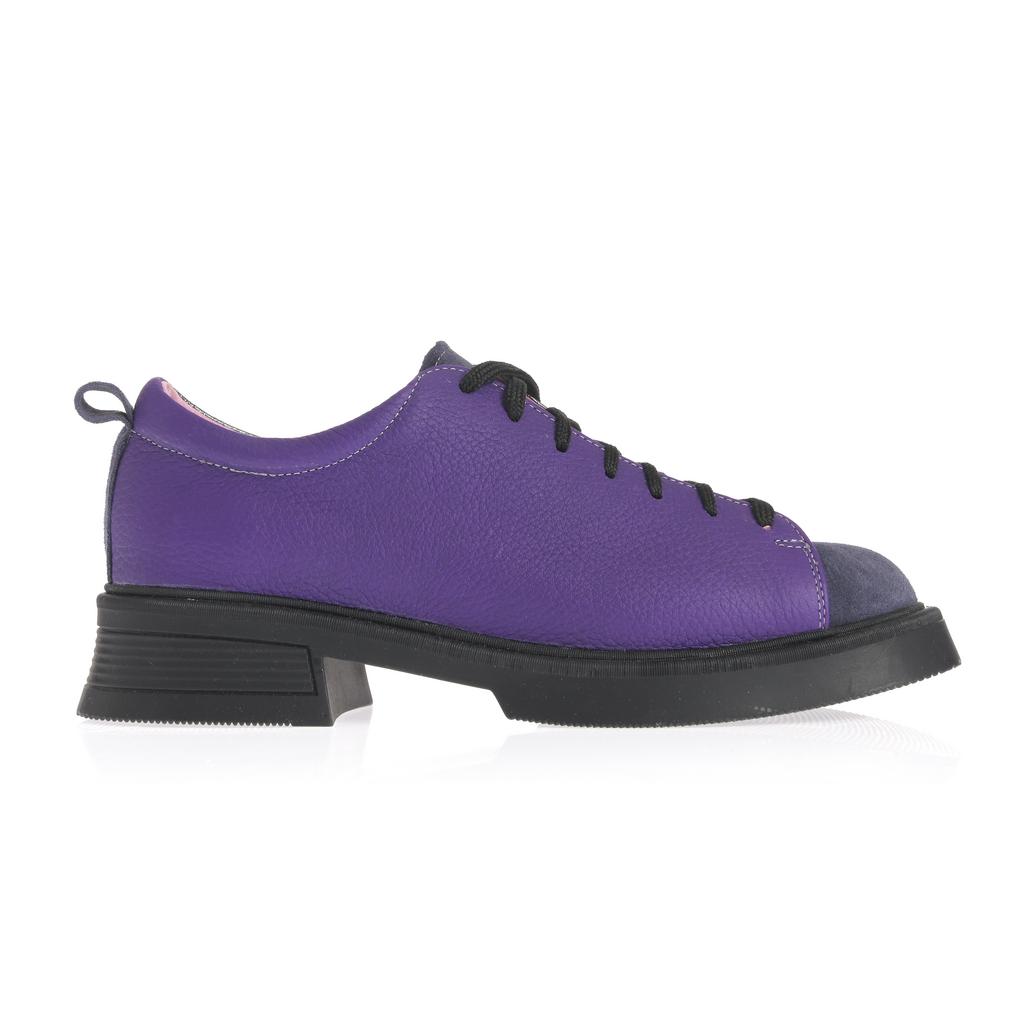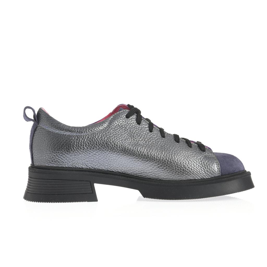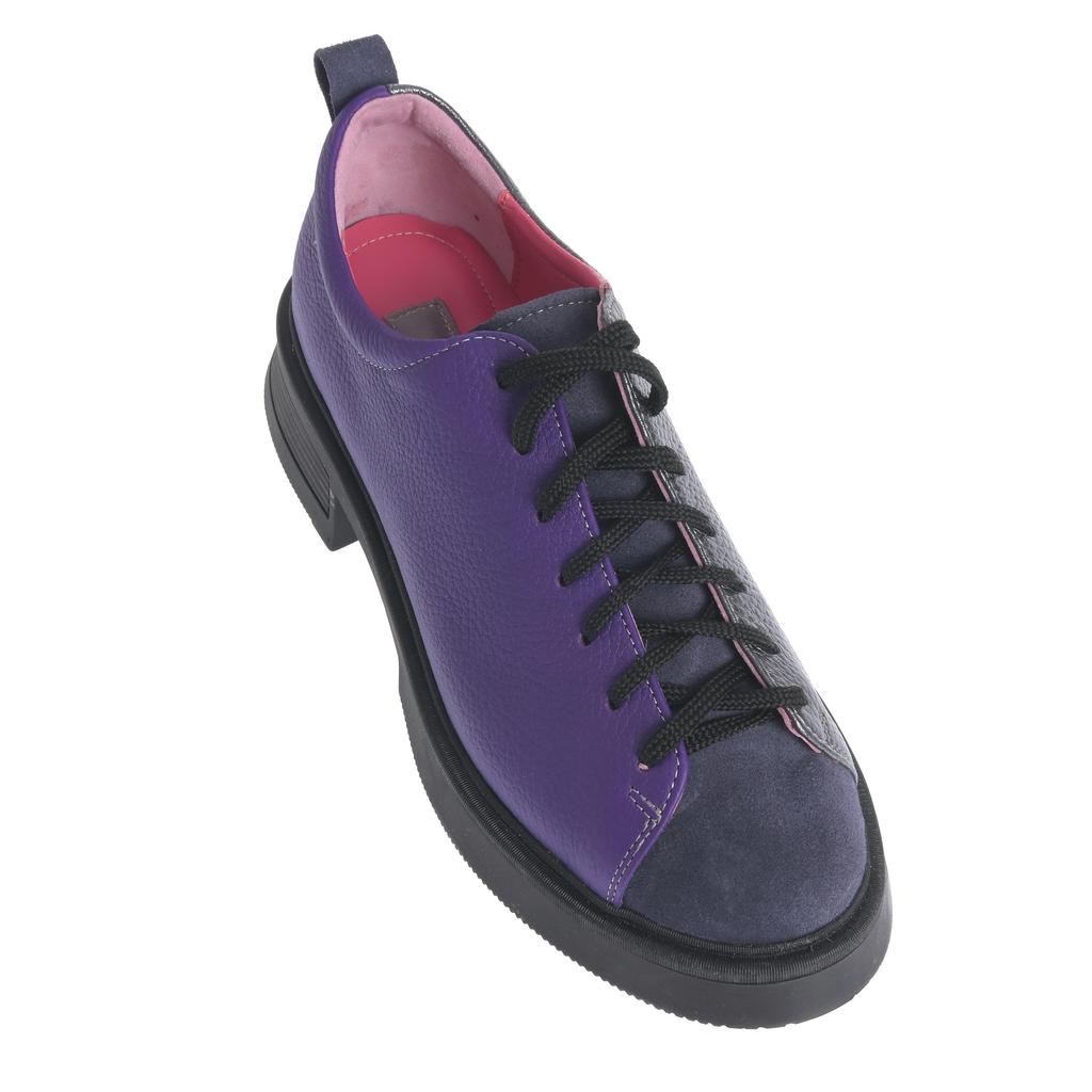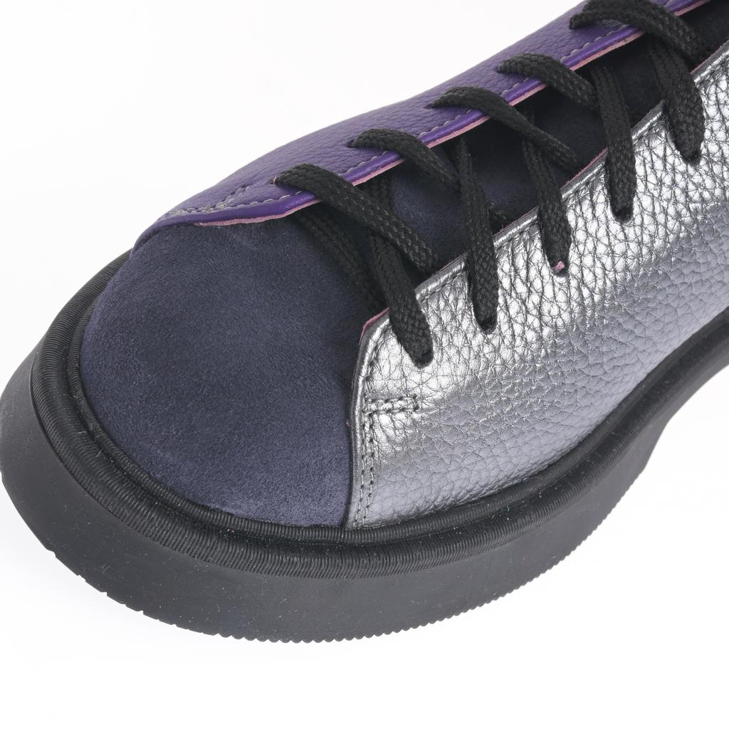 Acest sneaker casual Madalina combină stilul și confortul, fiind realizat din piele sintetică și piele intoarsă. Designul interesant în culori mov și argintiu, împreună cu interiorul roz căptușit, asigură o purtare plăcută pe tot parcursul zilei. Talpa din cauciuc robustă și ușor texturată oferă tracțiune, iar sistemul de închidere cu șireturi garantează o fixare ajustabilă. Perfect pentru ținutele casual, acest model are o formă rotunjită a vârfului și acoperire joasă la glezna, ideale pentru un look modern și confortabil.